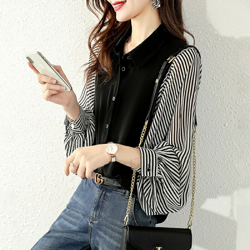 商品名 ブラウス シャツブラウス ストライプ 袖 切り替え レディース 長袖 シャツ トップス ゆったり ブラウス ボリューム袖 前開き 体型カバー おしゃれ バルーン袖 オフィス オフィスカジュアル 大人 ストライプシャツ 春 夏 秋 冬 送料無料