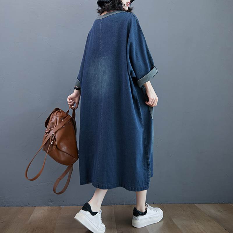 ワンピース ロング ゆったり ルーズ デニム 厚い ミモレ丈 Vネック 長袖 袖あり ポケット付き ウォッシュドデニム シンプル コントラスト 配色 ドルマンスリーブ バットスリーブ 大きめ 体型カバー お洒落 おしゃれ ママ マタニティ 通勤 お出かけ デート 旅行 休日 レディース 30代 40代 春 夏 秋 大きいサイズ M L XL 2XL ブルー 青