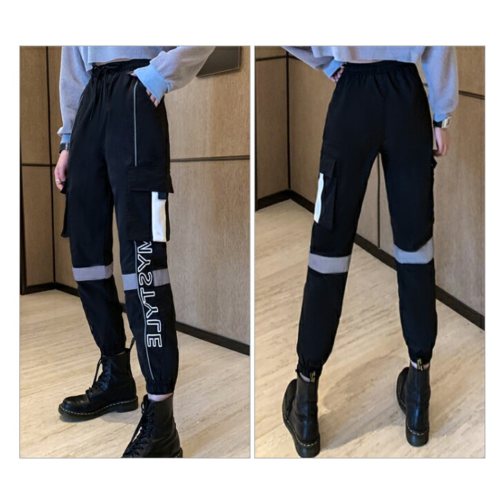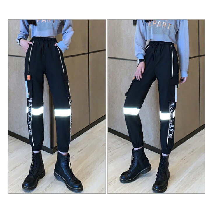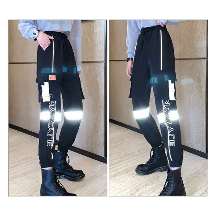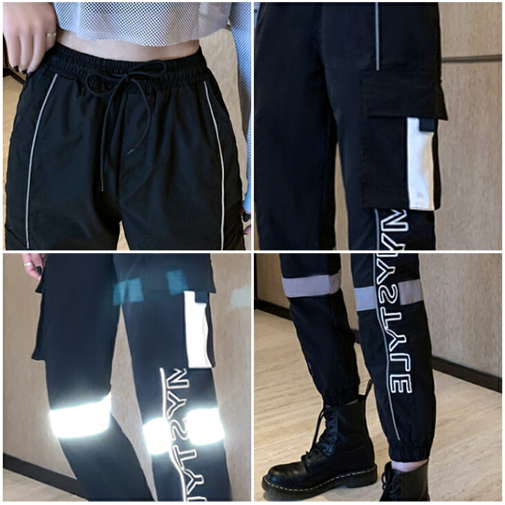 レディース パンツ ダンス ジョガーパンツ 発色 発光 反射材付き トラックパンツ 反射材 英ロゴ 英文字 ブラック