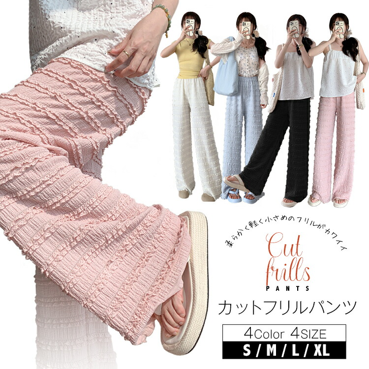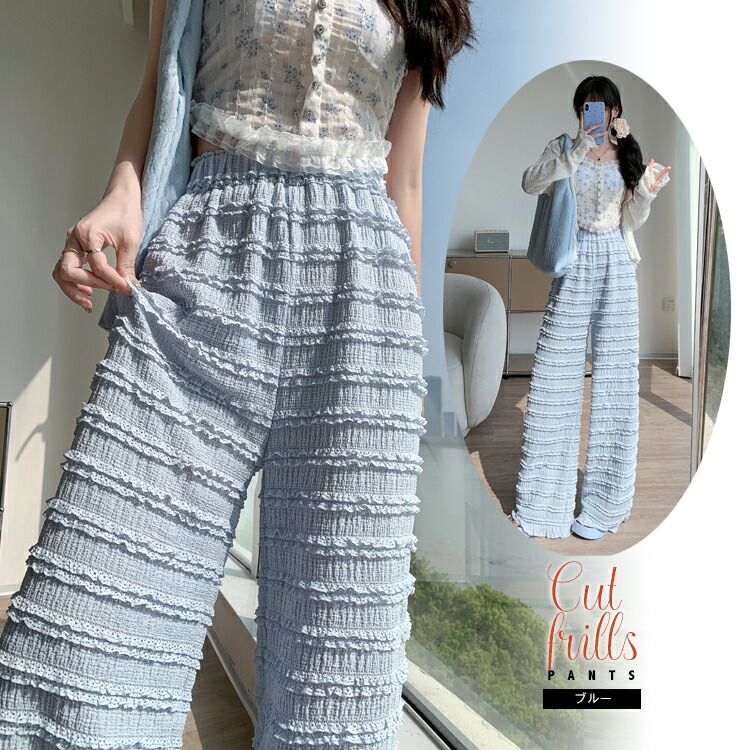 カットフリル ワイドパンツ レディース ハイウエスト ワイドパンツ ミルフィーユ レース フリル ボトムス 春夏 ゆるふわ フレアパンツ ロング丈 ウエストゴム レイヤード 重ね着