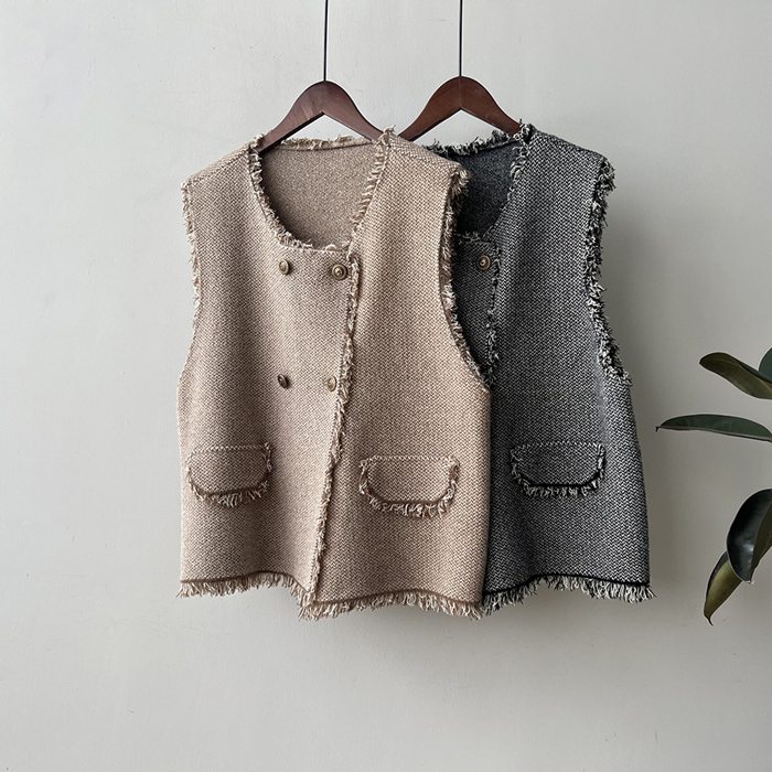 ベスト ツイードベスト レディース ジレ ツイード ジレベスト アウター ジャケット ロングジレ カーディガン 秋 冬 ノーカラー 羽織り 前開き ミックス ボタン ノースリーブ ゆったり