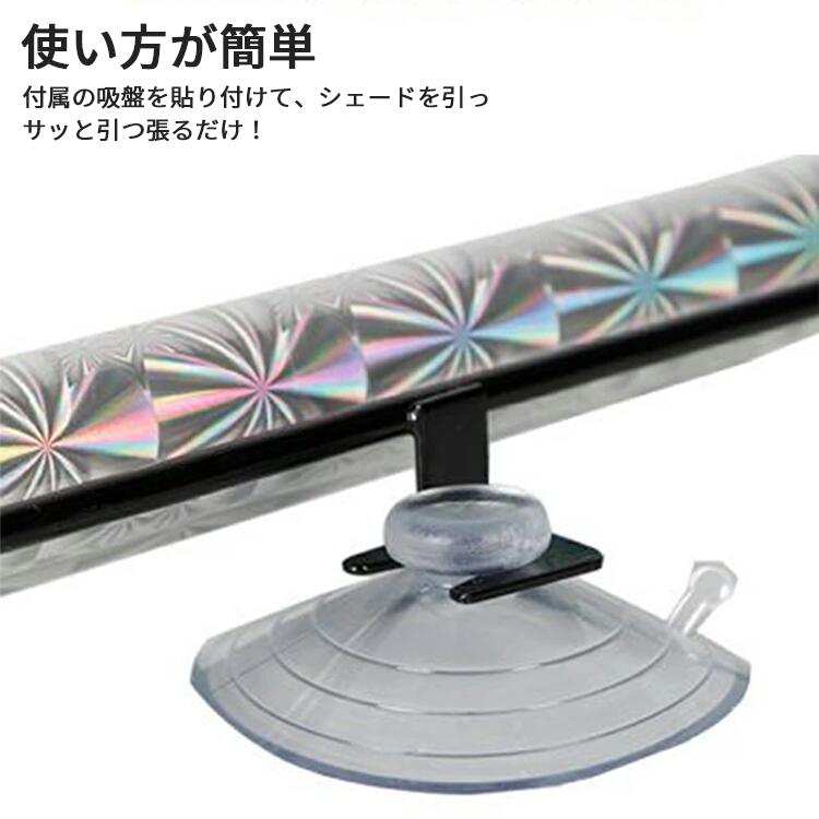 サンシェードの展開:ロール部分を引き出し、サンシェード全体を広げます。必要に応じて調整し、フロントガラス全体をカバーします。