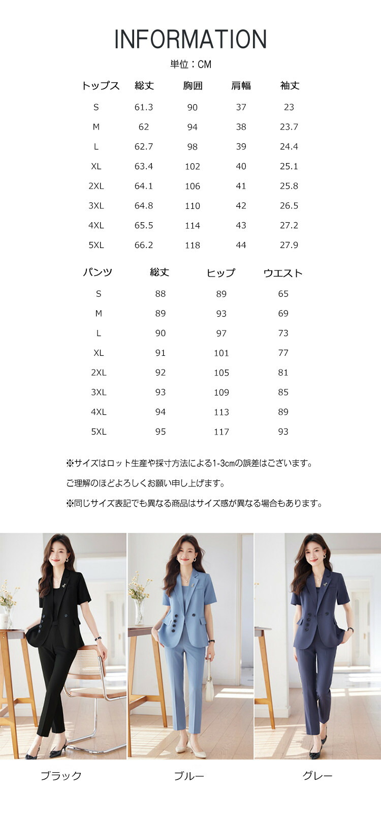 ※お取り扱い前に、商品付属タグの記載もご確認下さい。商品情報商品名 パンツスーツ レディース 半袖 ジャケット パンツ 九分丈 2点セット スラックス テーラード おしゃれ 夏物素材 ポリエステルカラー ブルージャケット|グレージャケット|ブラックジャケット|ブルーセット|グレーセット|ブラックセットサイズ S|M|L|XL|2XL|3XL|4XL|5XL生産国 中国包装について 環境保護の観点から、「簡易包装」を推進しております明細書について 当店ではエコロジーと個人情報流出防止のため、ご指示の無い限り明細書を発行しておりません。