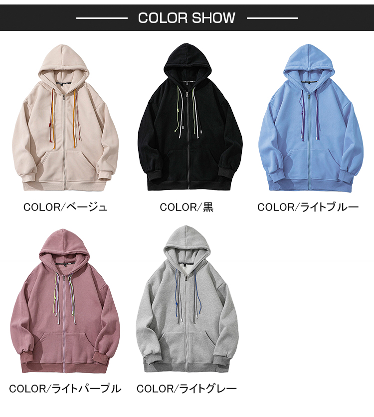 ※お取り扱い前に、商品付属タグの記載もご確認下さい。商品情報商品名 ジップパーカー レディース メンズ パーカー 秋物 運動 外出 アウター ダボダボ ポケット スウェットパーカー 学生 長袖 ジャンパー フーディ 帽子 秋 冬 無地 カラバリ おしゃれ素材 ポリエステル100%カラー ベージュ|黒|ライトブルー|ライトパープル|ライトグレーサイズ S|M|L|XL|2XL|3XL生産国 中国包装について 環境保護の観点から、「簡易包装」を推進しております明細書について 当店ではエコロジーと個人情報流出防止のため、ご指示の無い限り明細書を発行しておりません。