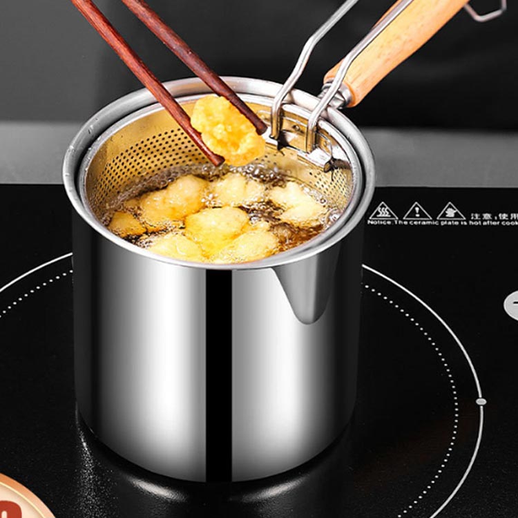 嬉しいストレーナー付、揚げ物を一気に引き上げられ、時間差により揚げムラを防ぎます。そのまま油切りできるから楽チン。
