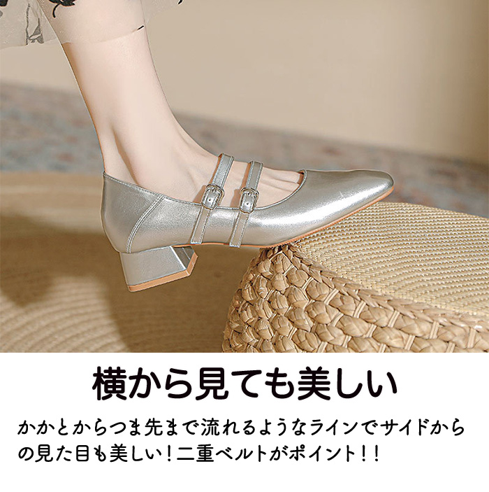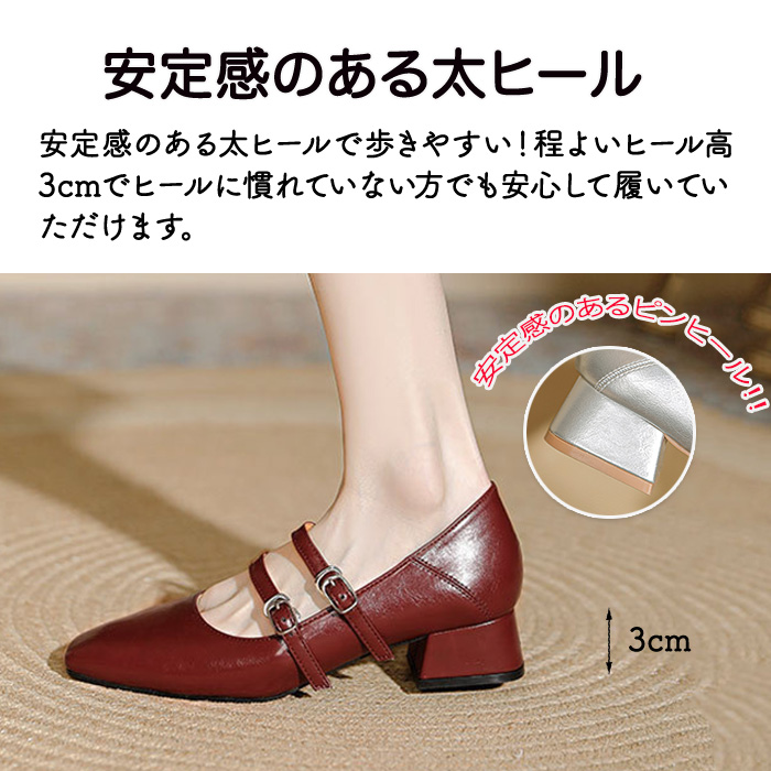 ンプス レディース 甲浅 美脚効果 ローヒール 太ヒール シンプルパンプス 二重ストラップパンプス フォーマル 履きやすい 安定感のある太パンプス 大人 通勤 二次会 発表会 結婚式