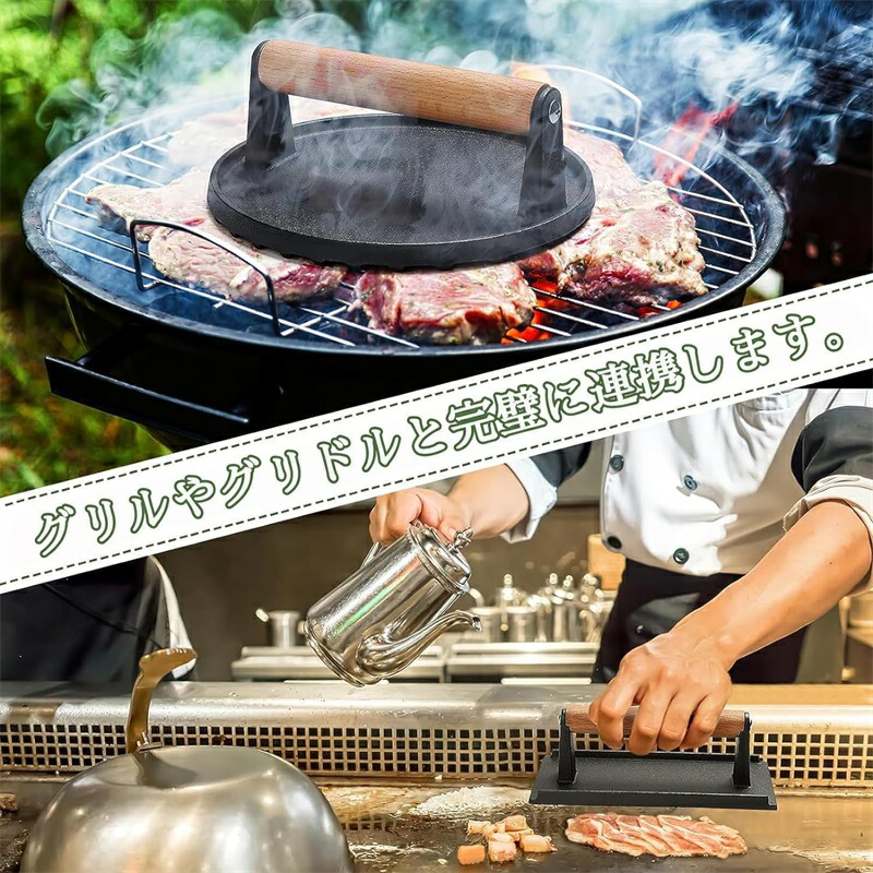重し ミートプレス 肉 鋳鉄 ハンバーガープレス 食肉プレス ベーコンプレス 錆びない 大型 プレス機 料理 鋳物 ステンレス グリルミートプレス 木製ハンドル 調理器具 波型 海鮮