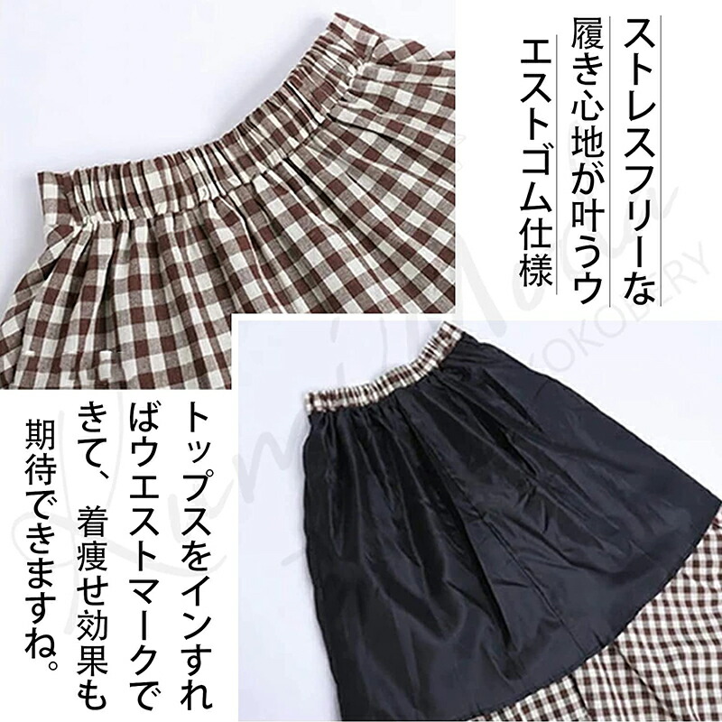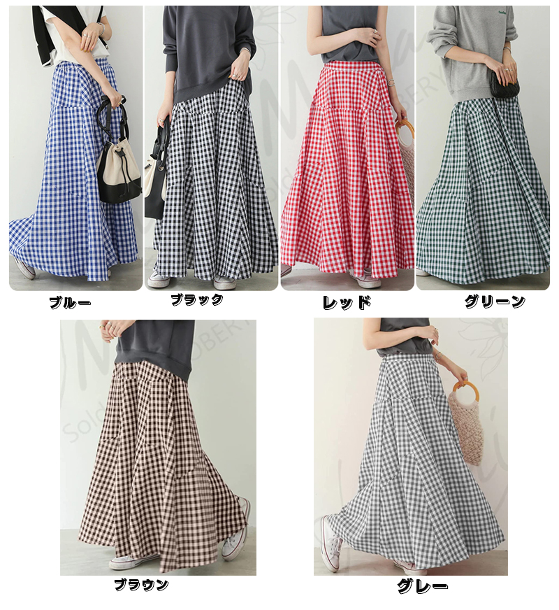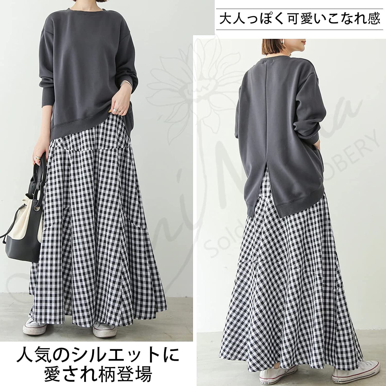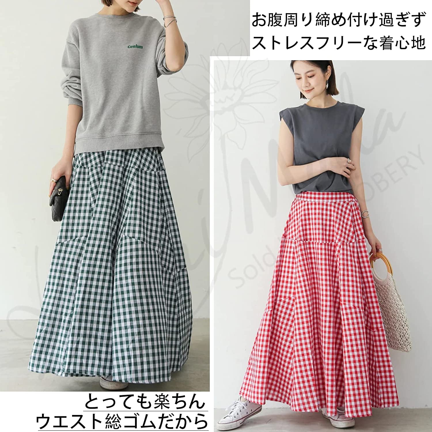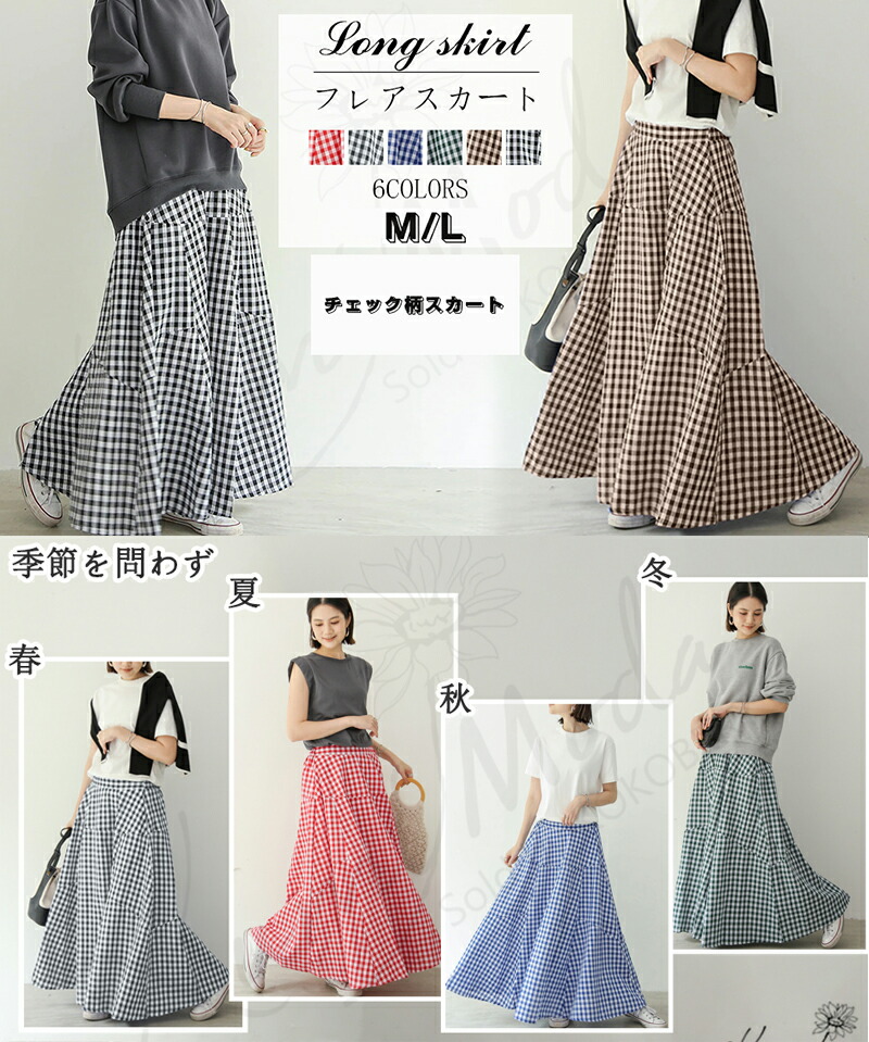 【大人っぽく可愛いこなれ感】デイリーにオールシーズン使えるロングスカート。子供っぽくならないギンガムチェックがオシャレ。10代、20代、30代と世代問わず幅広くお使い頂けます。フレアシルエット&ロング丈で 気になる下半身がかくれて安心!多少の着丈の調節もウエストの位置で調節可能! 身長やご希望の着こなしに合わせて着丈をお選びいただけます。ウエストのゴムは幅が広めになっているので、トップスをインすればウエストマークできて、着痩せ効果も期待できます。