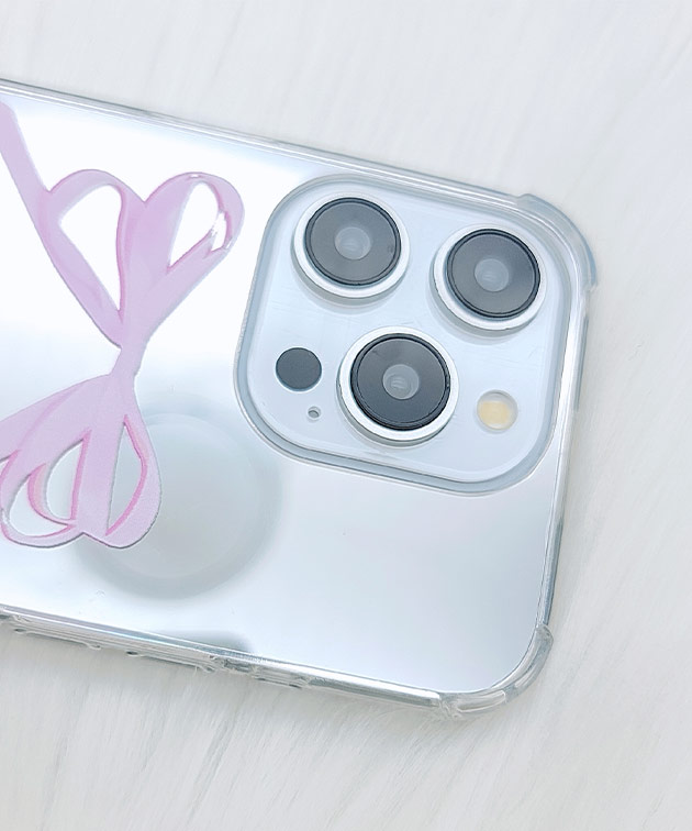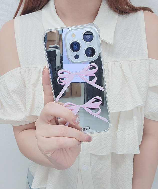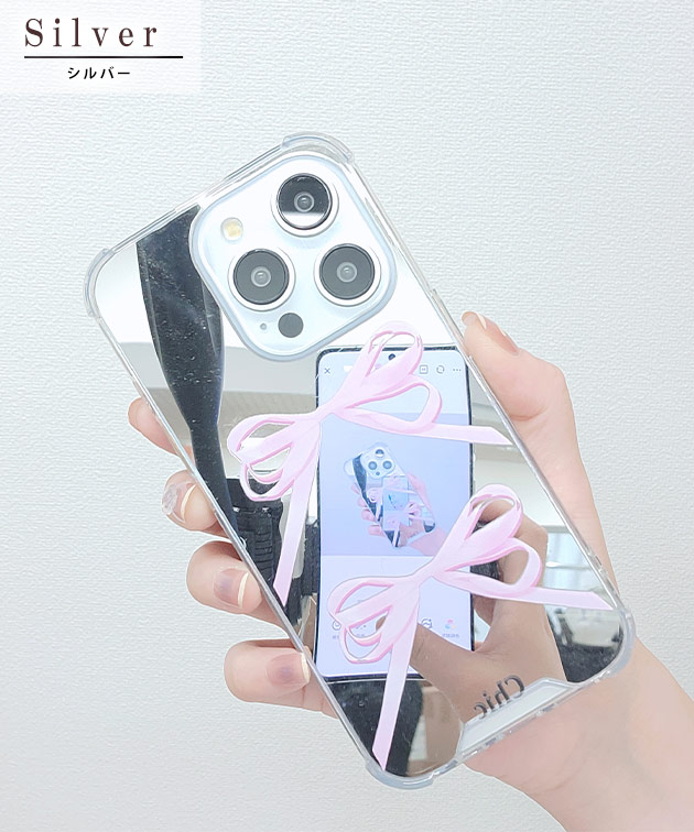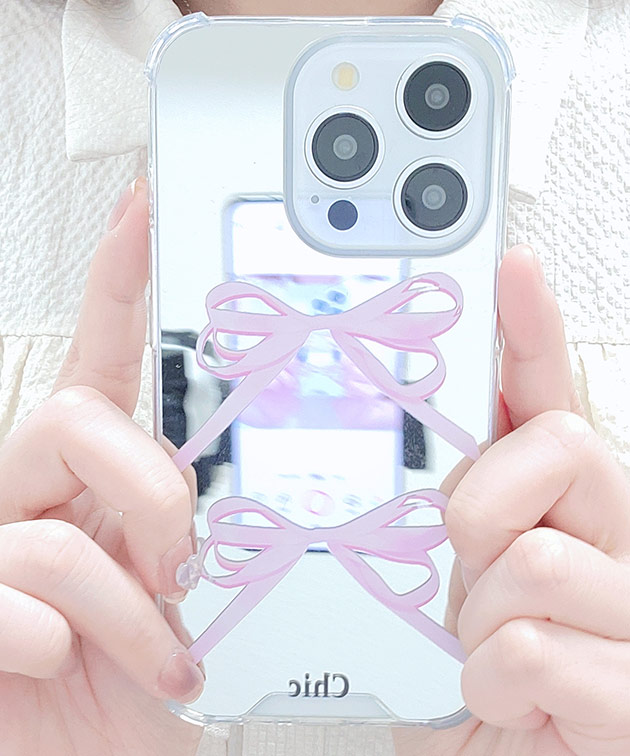 ピンク リボン ミラー iPhone ケース 女性 レディース スマホ カバー 光沢 TPU プラスチック 鏡 シンプル スタイリッシュ ミニマル 可愛い ガーリー キュート 大人 華やか エレガント