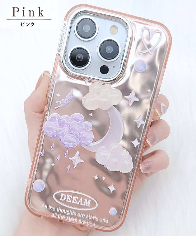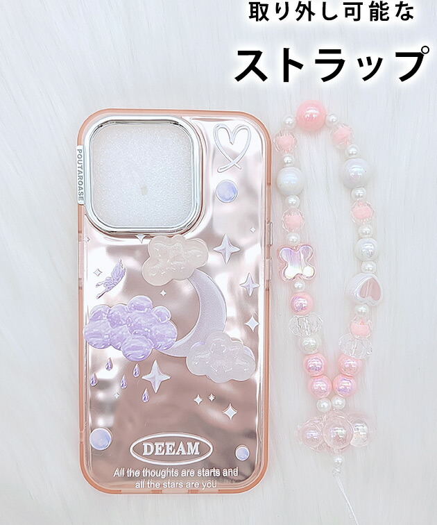 ゆめかわ ストラップ付き ミラー iPhone ケース 女性 レディース スマホ カバー アクセサリー 立体 3D 雲 月 ドリーミー ドリーム 夢 ボール パール ビーズ クリア 鏡 ハート 可愛い