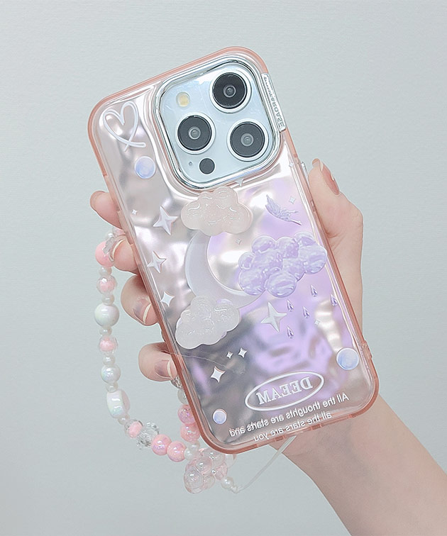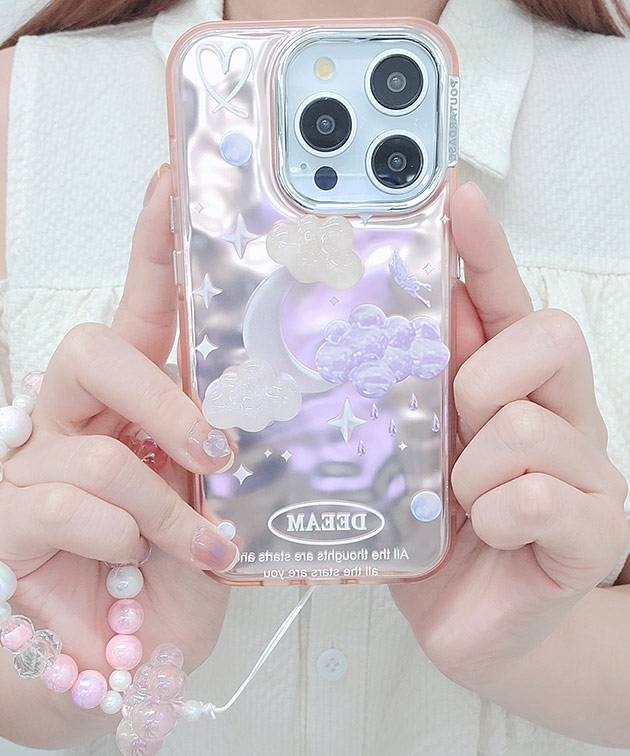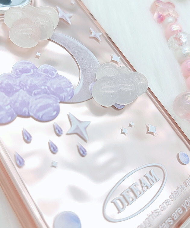 雲や月、バタフライなど、トレンドのゆめかわモチーフでドリーミーな表情に仕上げたiPhoneケース。