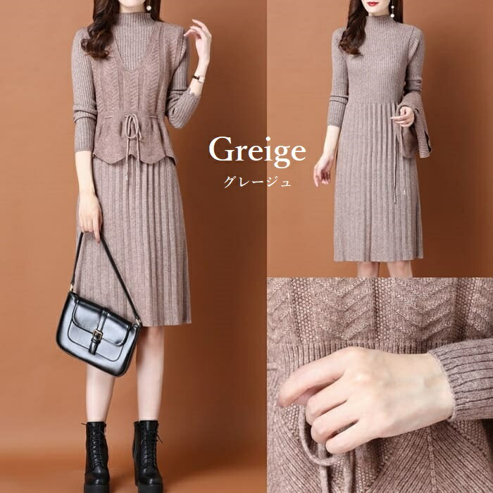 商品名ニットベスト×ワンピース ベスト Vネック ニットワンピース 長袖 膝丈 膝下 プリーツ