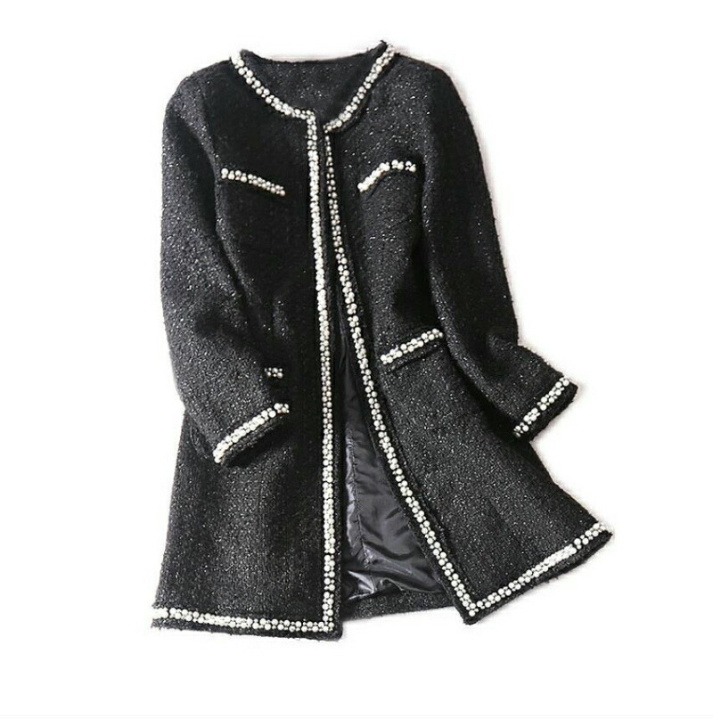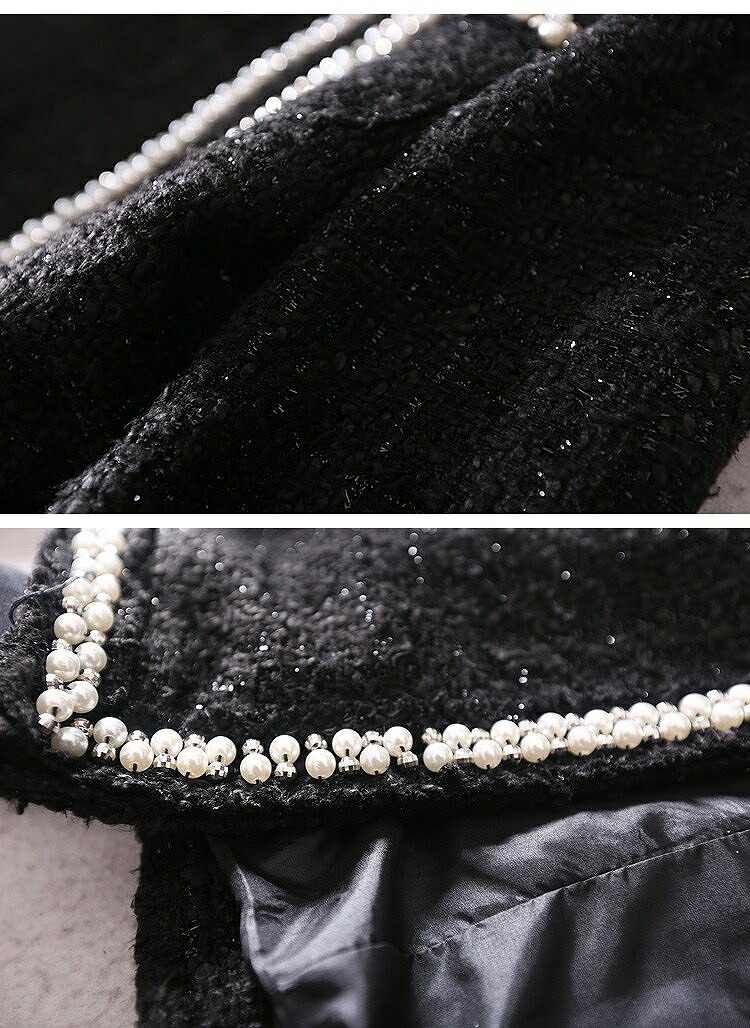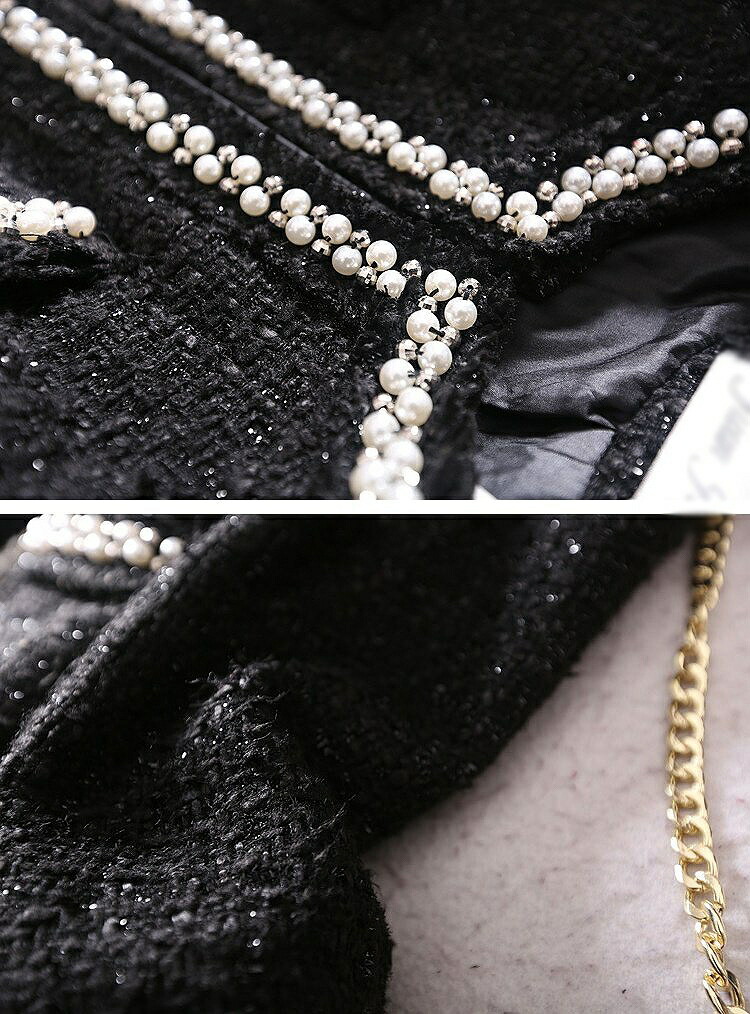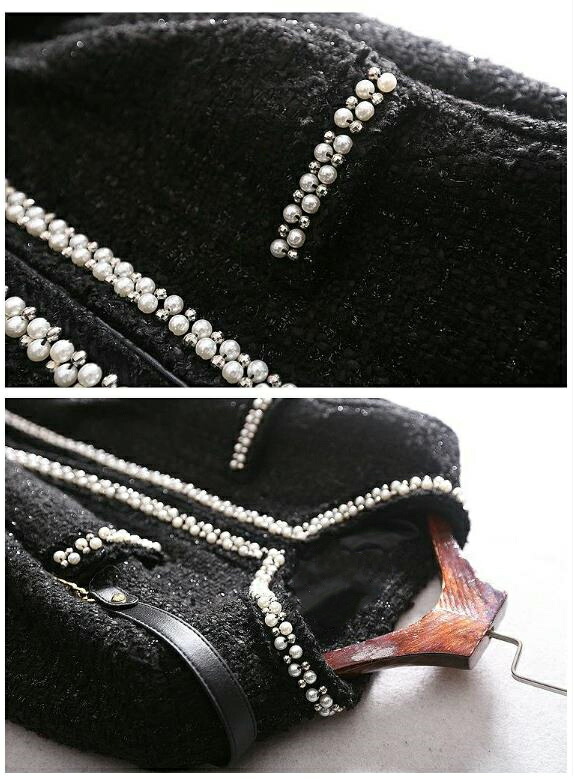 ふんだんにあしらわれたパールとビジュー煌めくノーカラーコート 落ち着いたモノトーンカラーでシーンを選ばず着こなせます.高級感MAX
