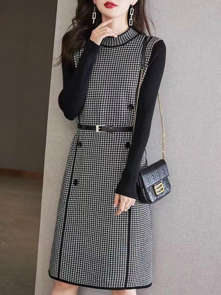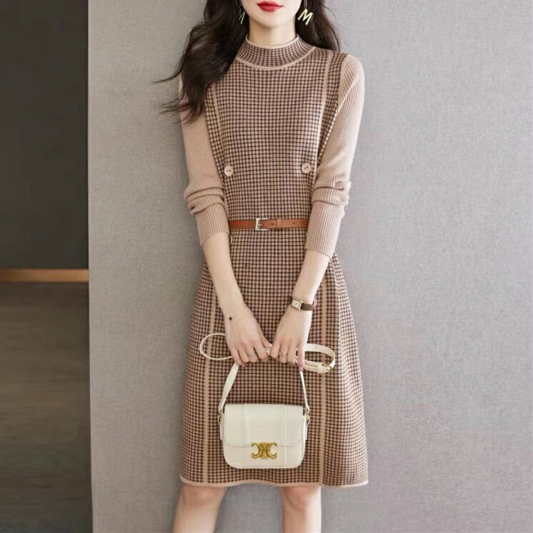 ニットワンピース 膝丈 ワンピース 長袖 厚手 大きいサイズ 大人かわいい 美人 レディース 秋 冬 30代 40代 50代 ブラック ベージュ モックネック チェック柄 ダブルボタン きれいめ 上品