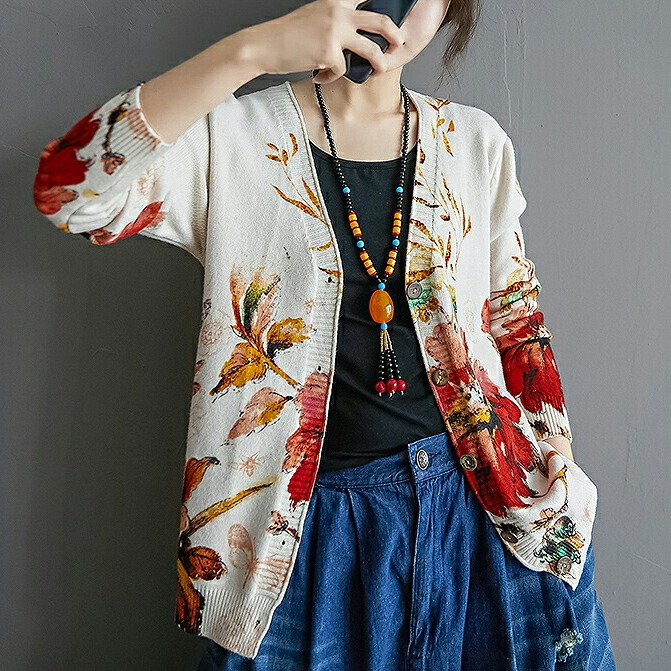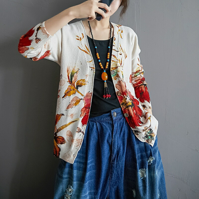まるで絵画のような花柄カーディガン 気品を感じる色使いと抜群のデザイン性が目を惹くアイテムですレディースファッション トップス カーディガン ボレロ