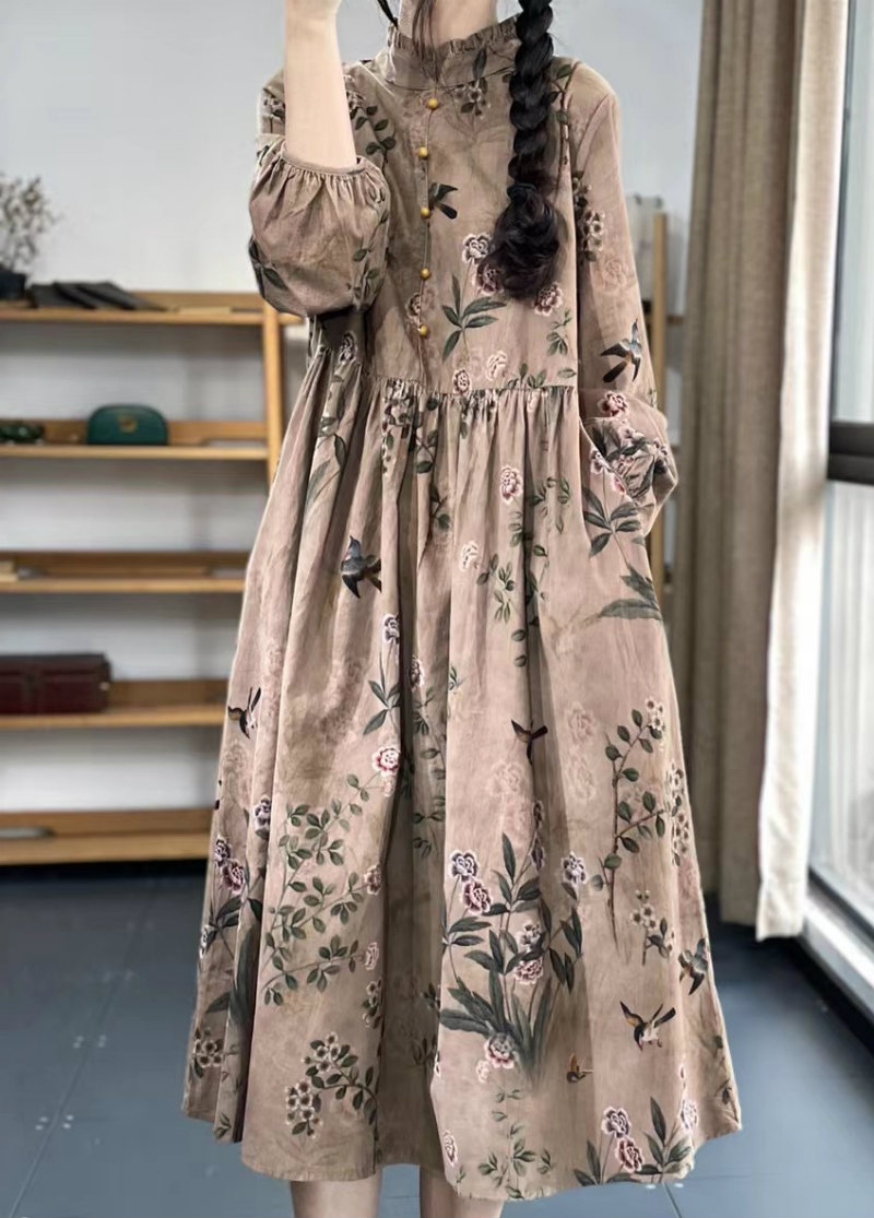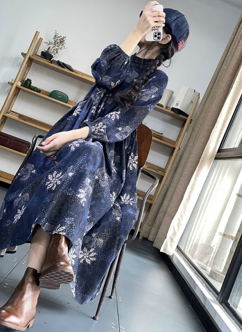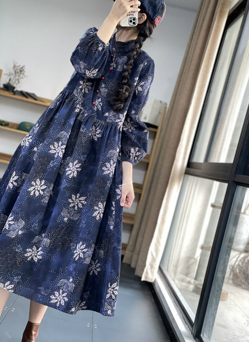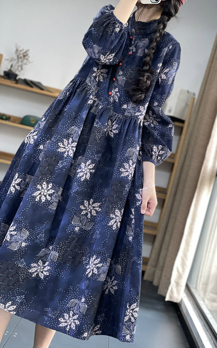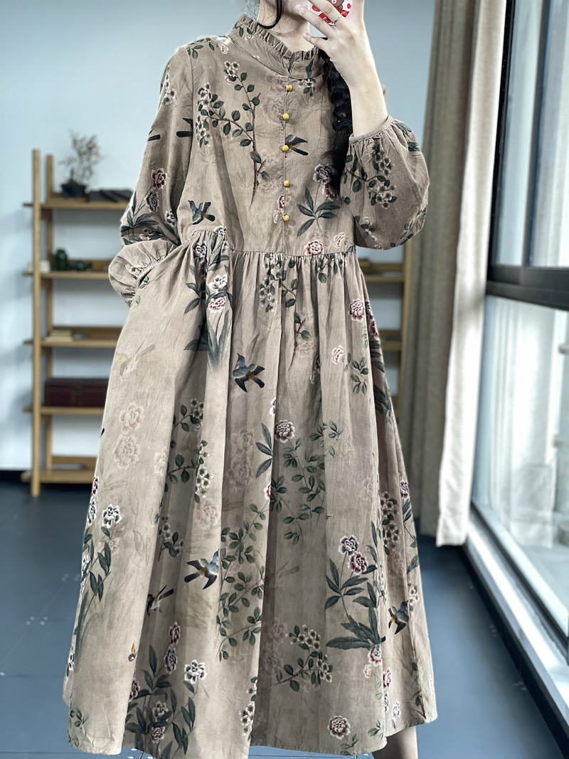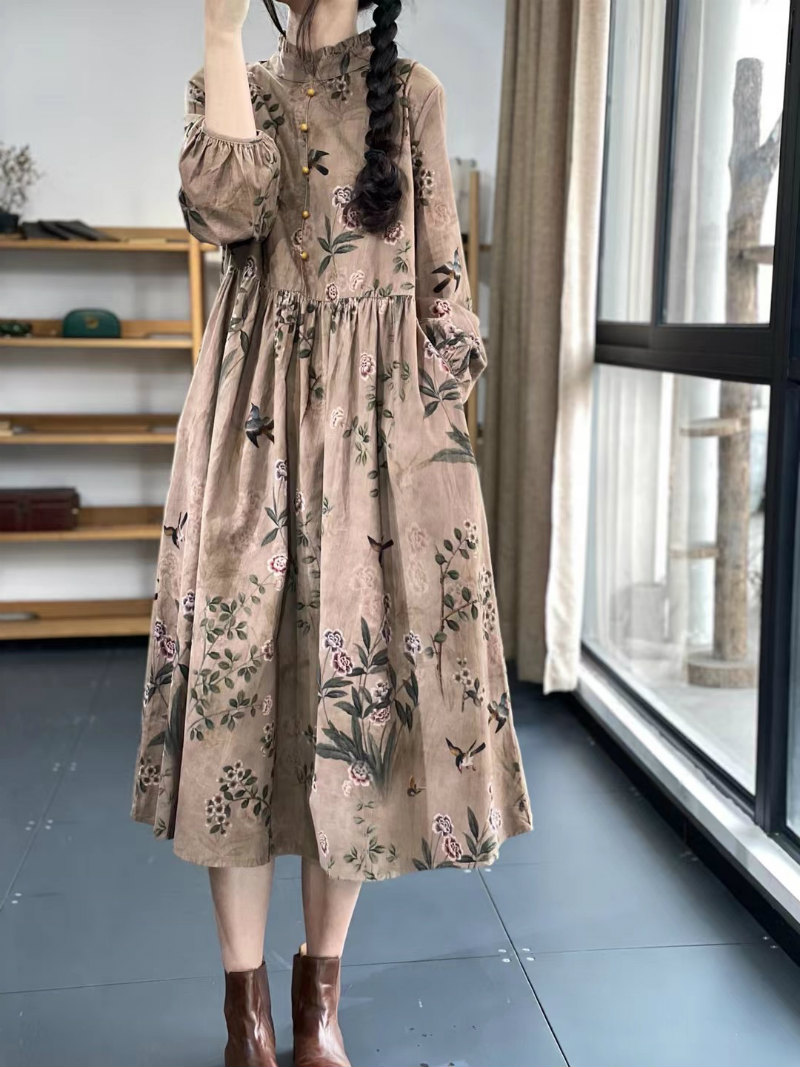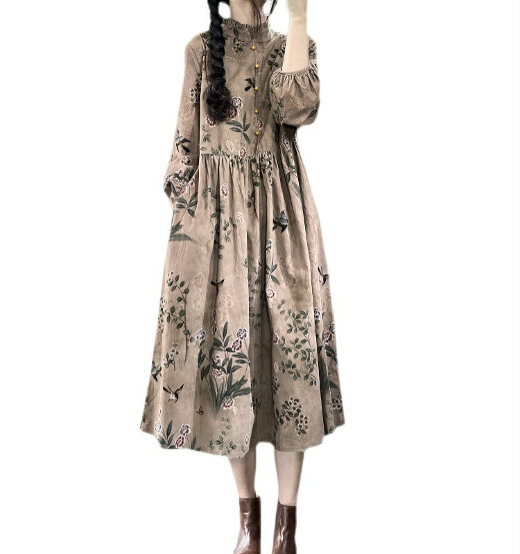 ワンピース 長袖 ミモレ丈 膝下 花柄 花柄ワンピース スタンドカラー 大きいサイズ 大人かわいい 秋 冬 春 美人 レディース 30代 40代 50代 ブルー ベージュ クラシカルワンピ レトロ レ