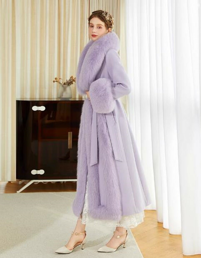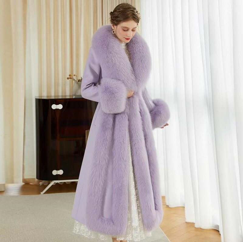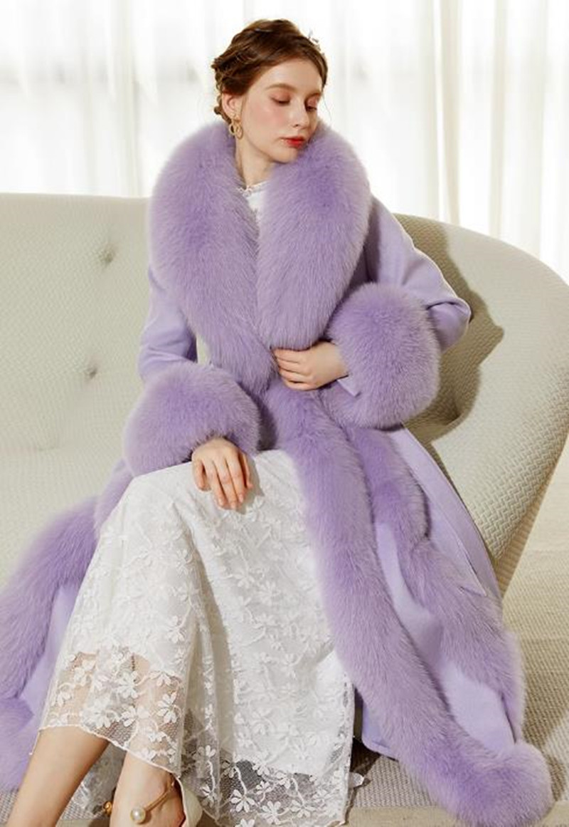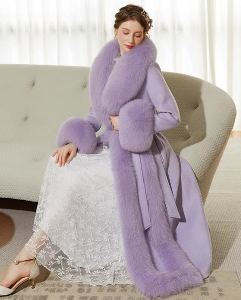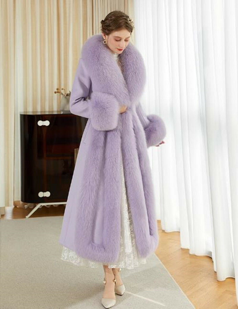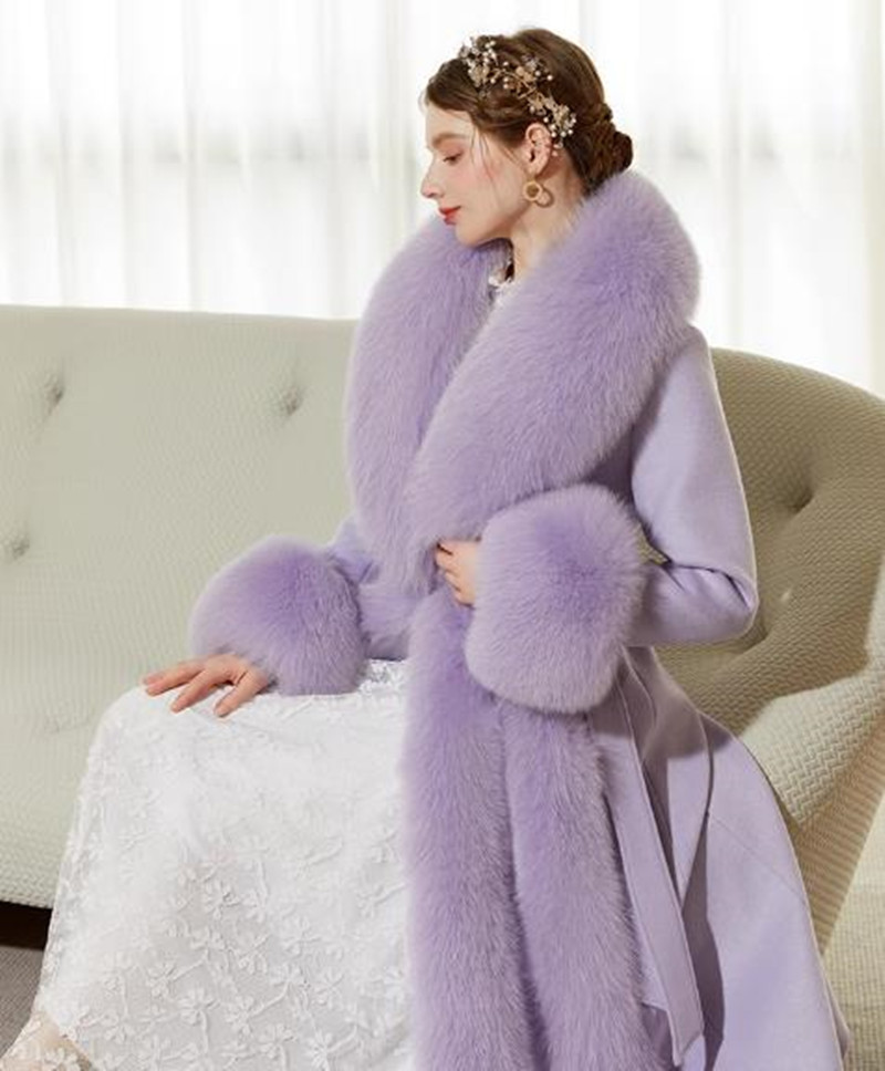 ウールコート レディース フォックスファー コート 高級感MAX リアルファー ロング ロングコート 贅沢 お洒落 大きいサイズ かわいい おしゃれ きれいめ 紫 冬 秋 通勤 シンプル 暖かい アウ