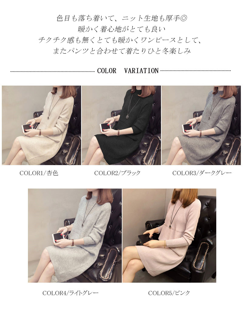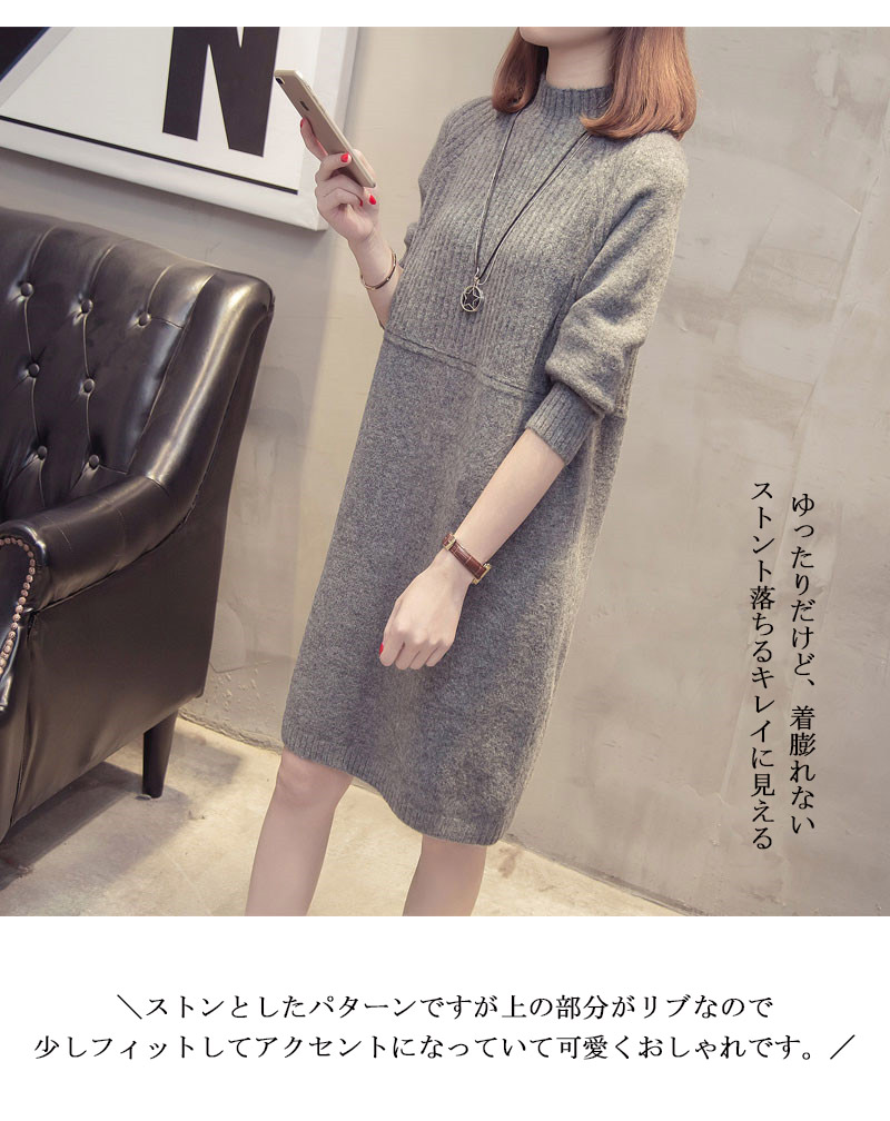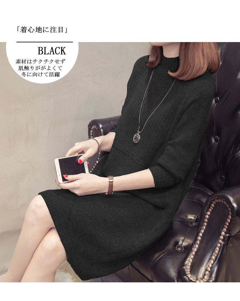 プチハイネックニットワンピース、膝丈ニ