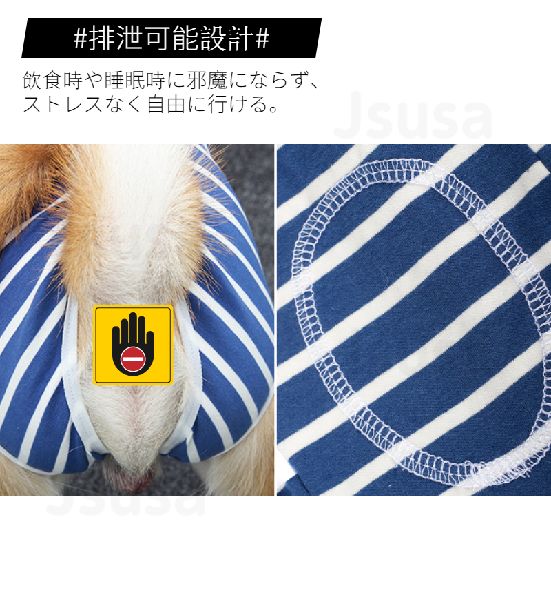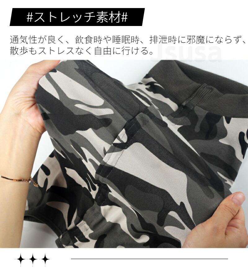 伸縮性も兼ね備え、動きやすく、締めつけのない着用感を保つために伸縮性にもこだわった素材を選んでいます。 丈夫で通気性もバッチリ!飲食時や睡眠時、排泄時に邪魔にならず散歩もストレスなく自由に行ける。