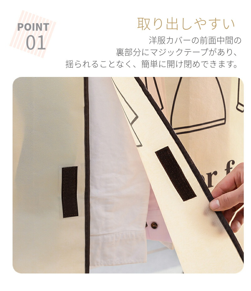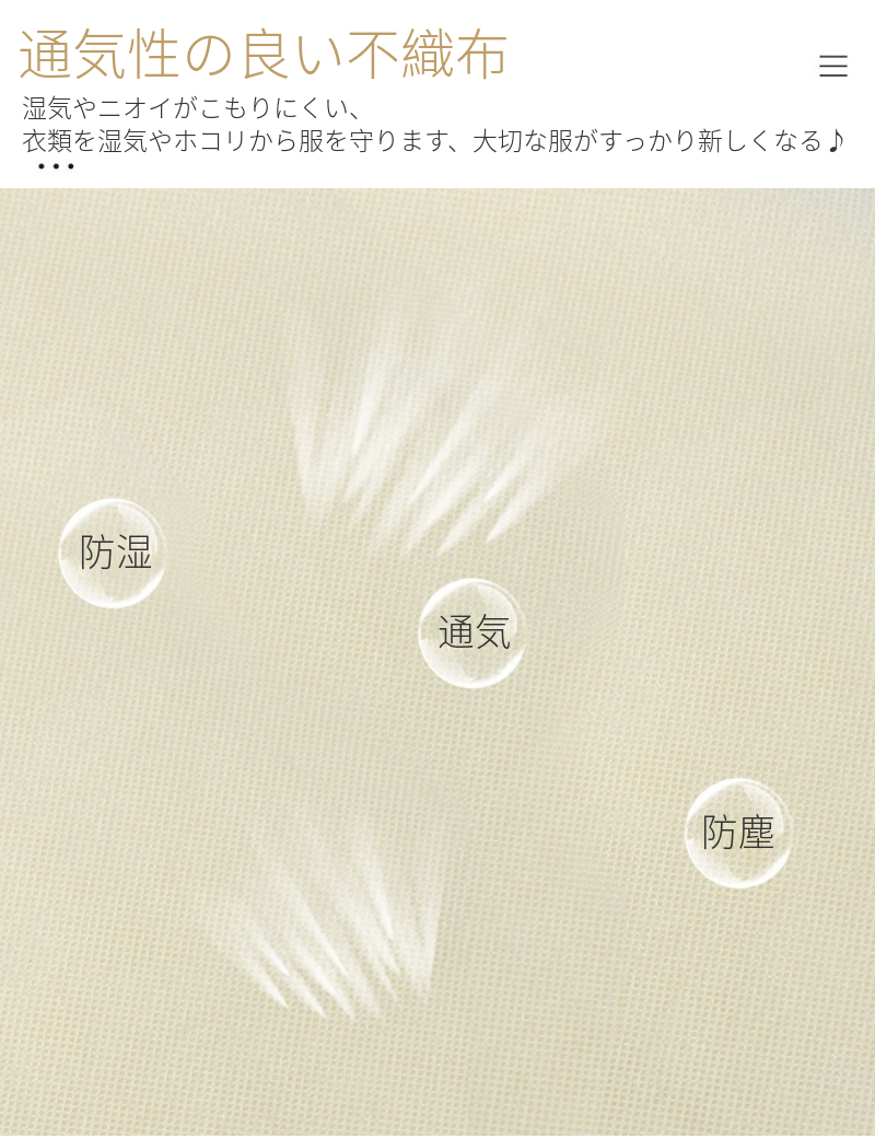 通気性に優れた不織布製の生地で、匂いを閉じ込めたりもしませんし大事な洋服をクリーニング状態で長持ちさせる事が出来ます。