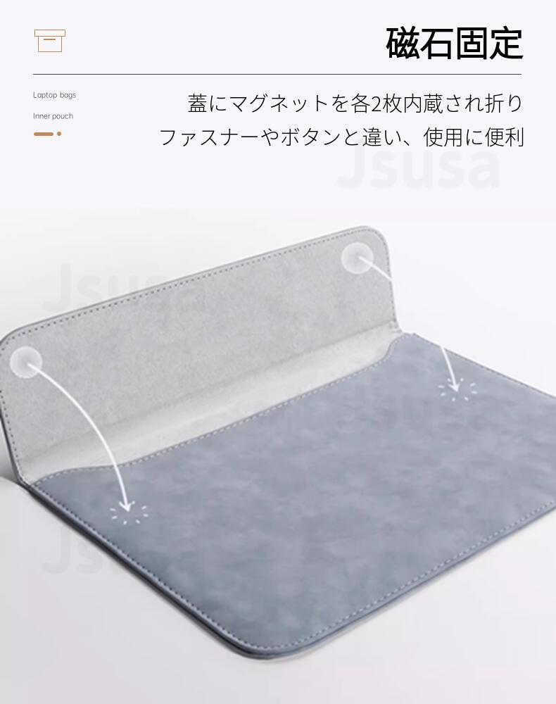 蓋とケースにマグネットを各2枚内蔵され、ファスナーやボタンなどの面倒くさいと感じなく、パソコンを出し入れる時にも楽になります。