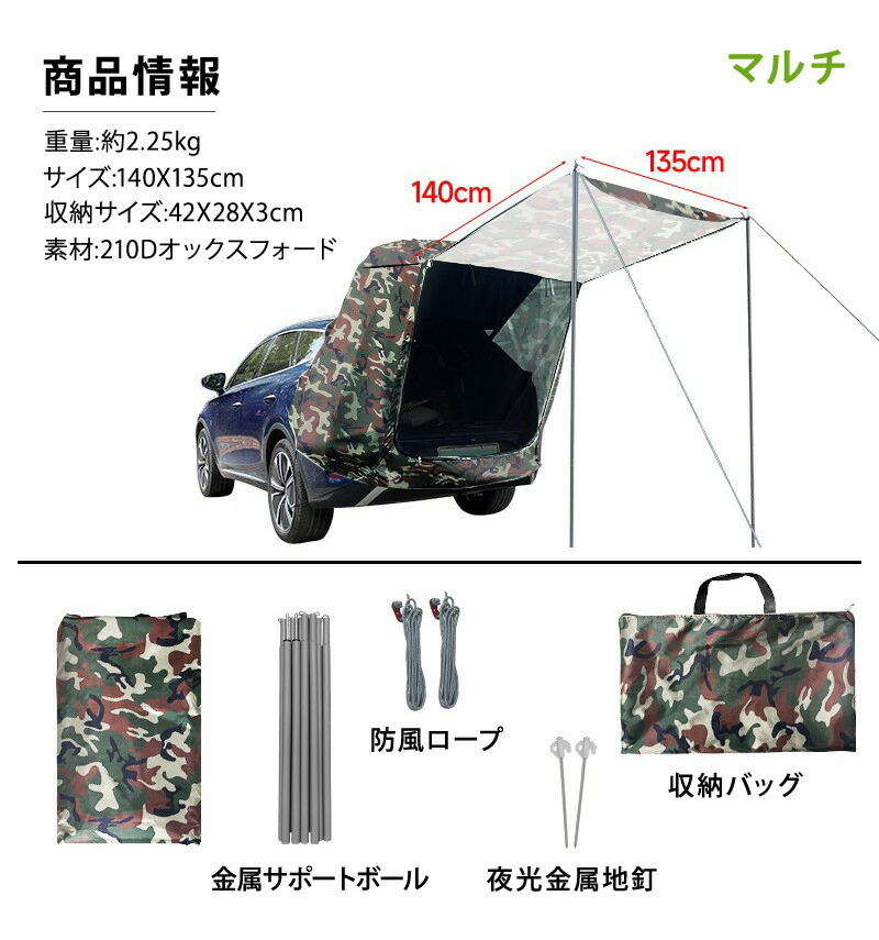 【付属品】:サポートポール*2、防風ロープ*2、夜光金属ペグ*2、収納バッグ*1