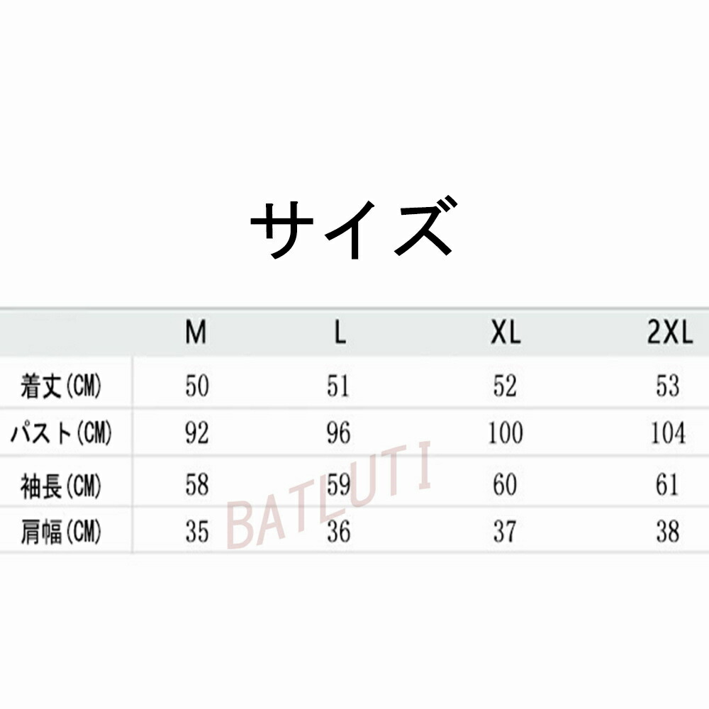サイズ(cm):M、L、XL、XXL M:着丈:80cm パスト:92cm 袖長:58cm 肩幅;35cm