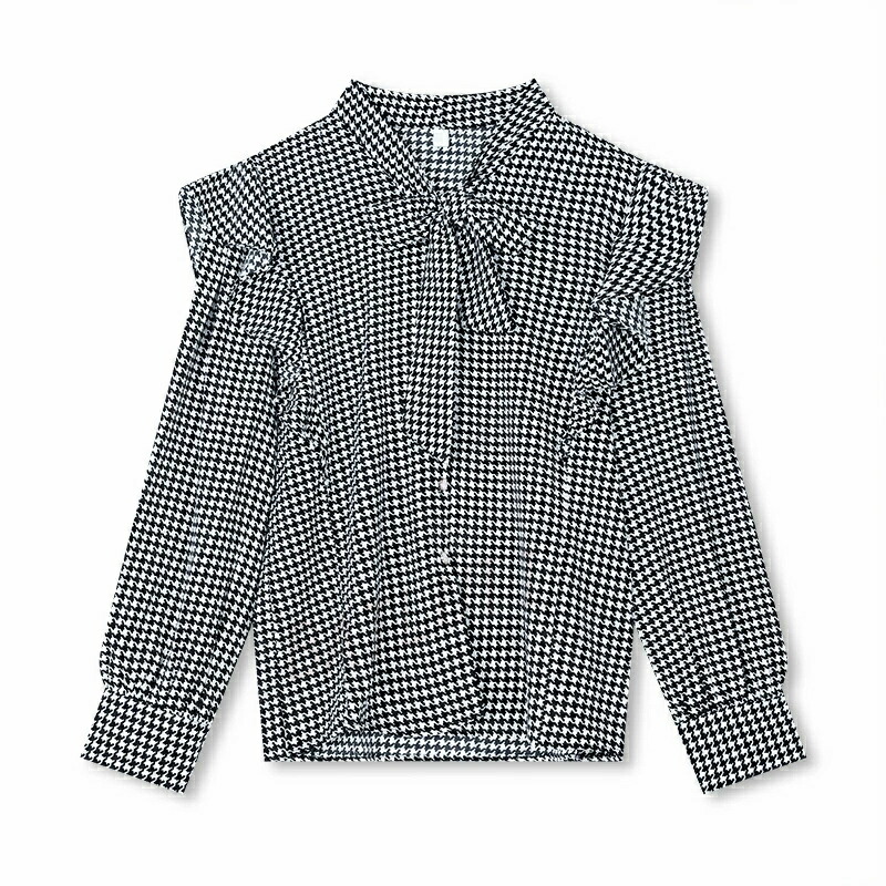 千鳥格子 ボウタイブラウス レディース 長袖 トップス リボンブラウス 千鳥柄 総柄 フリル 肩 シャツブラウス 前開き オフィス オフィスカジュアル