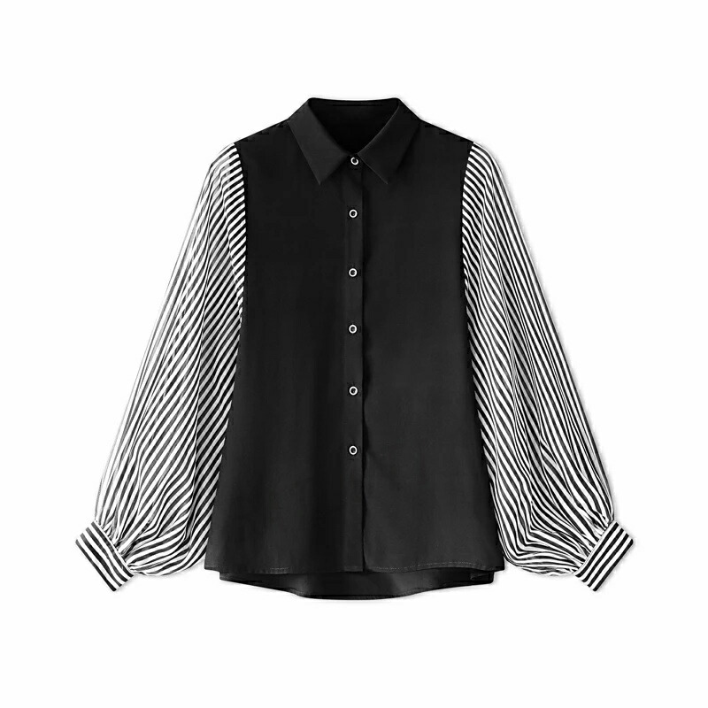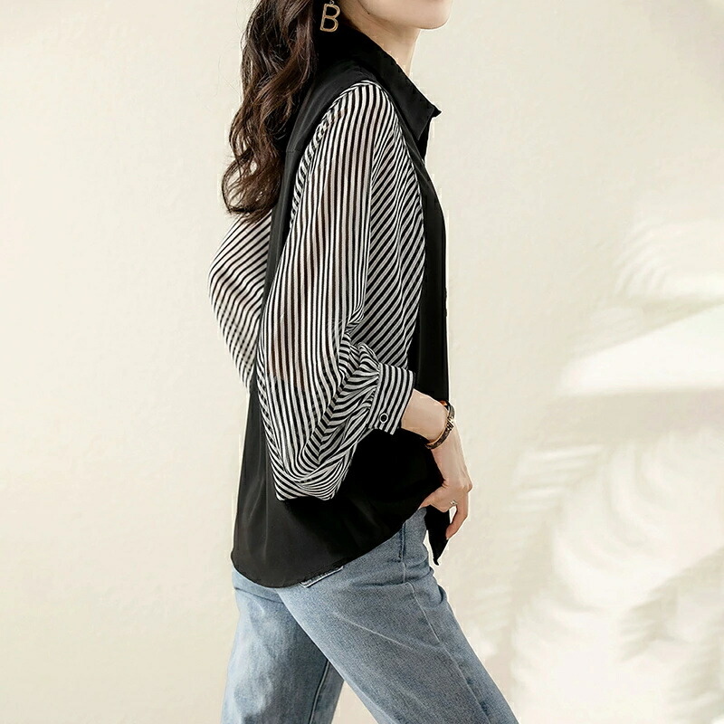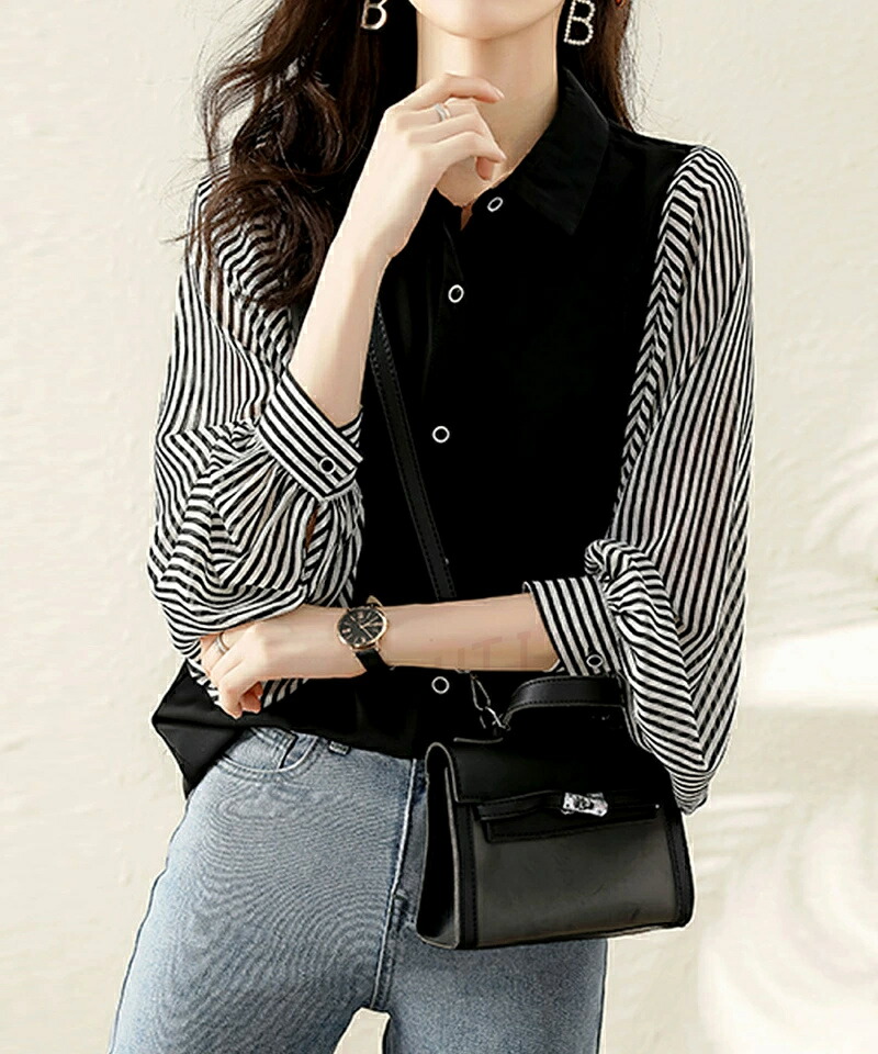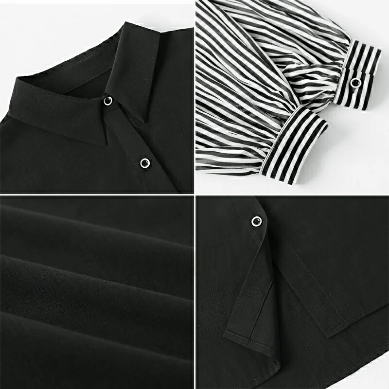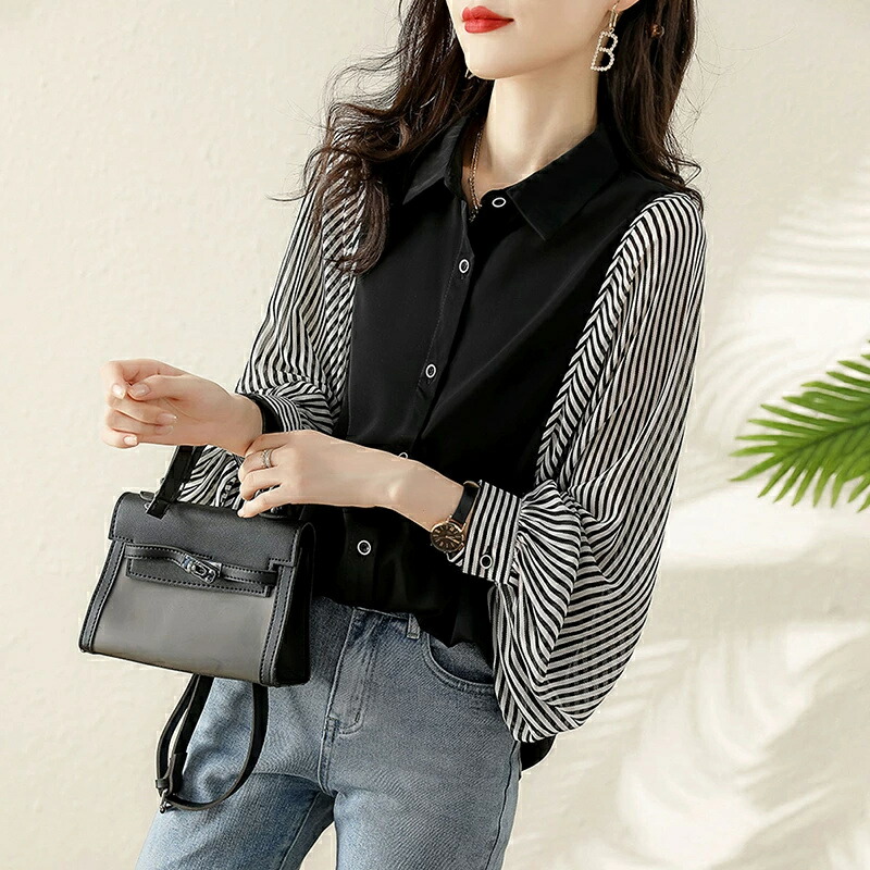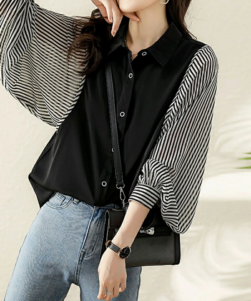 商品名 ブラウス シャツブラウス ストライプ 袖 切り替え レディース 長袖 シャツ トップス ゆったり ブラウス ボリューム袖 前開き 体型カバー おしゃれ バルーン袖 オフィス オフィスカジュアル 大人 ストライプシャツ 春 夏 秋 冬 送料無料