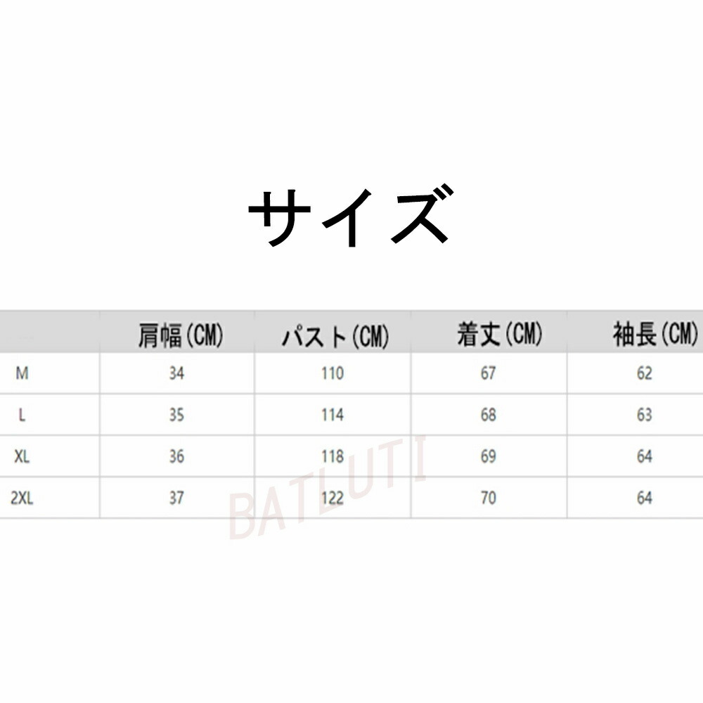 サイズ(cm):M、L、XL、XXL M:パスト:110CM 着丈:67CM 袖長:62CM 肩幅:34CM