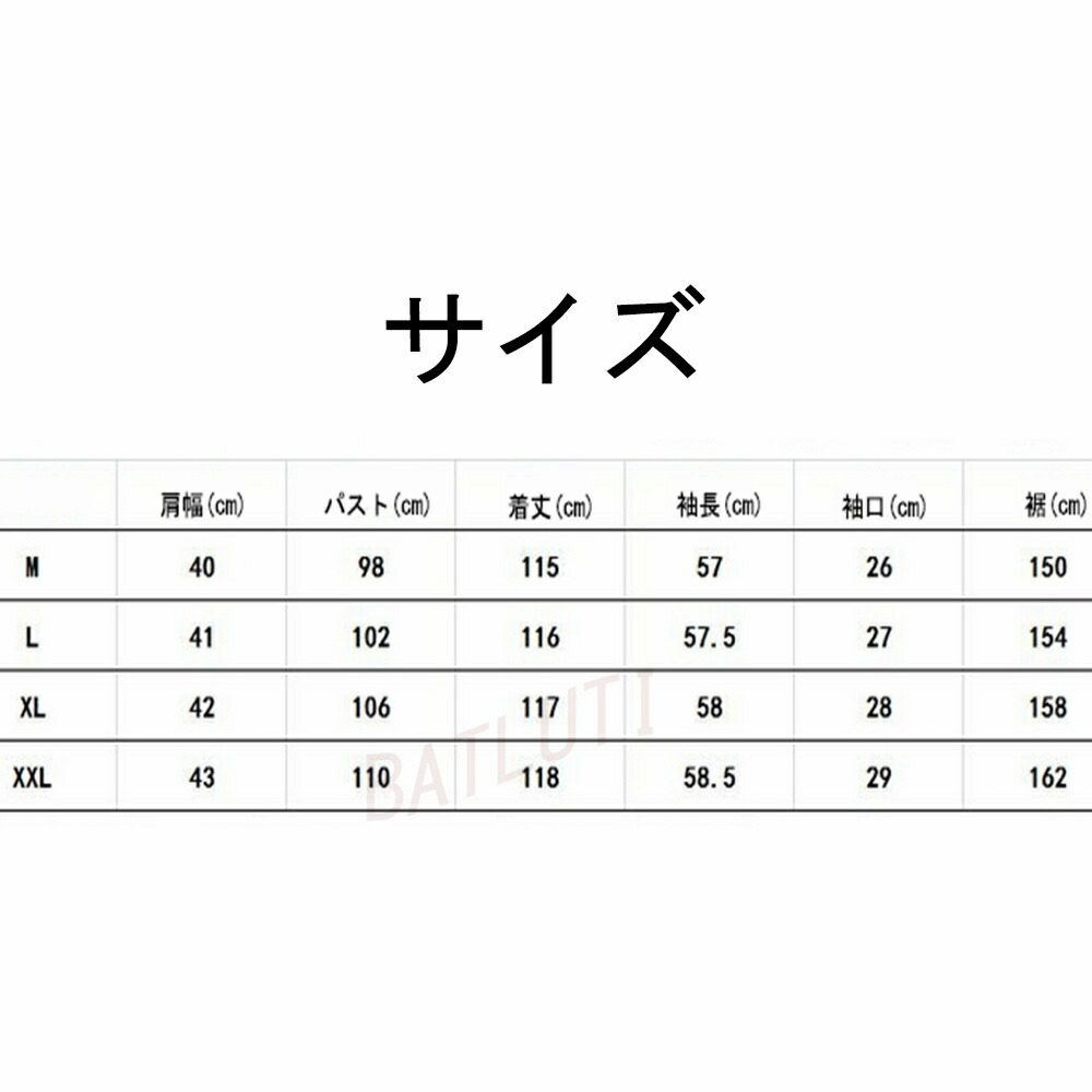サイズ(cm):M、L、XL、XXL M:パスト:98CM 着丈:115CM 肩幅:40CM 袖長:57CM 袖口:26CM 裾:150CM