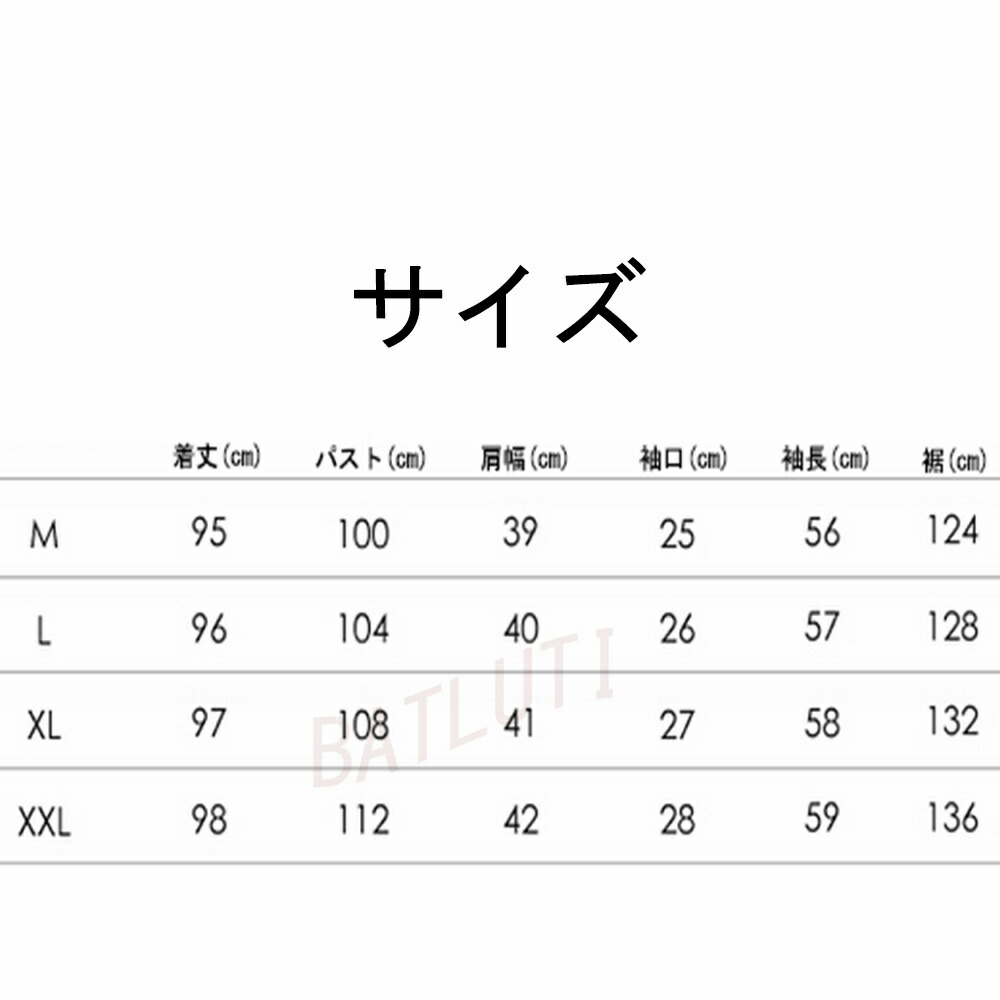 サイズ(cm):M、L、XL、XXL M:パスト:100CM 着丈:95CM 肩幅:39CM 袖長:56CM 袖口:25CM 裾:124CM
