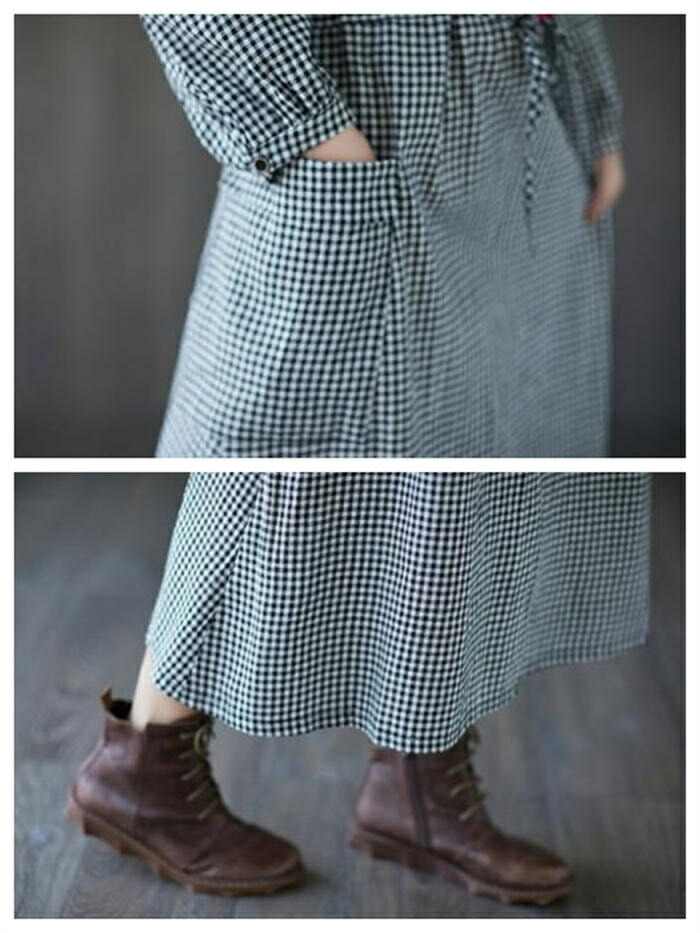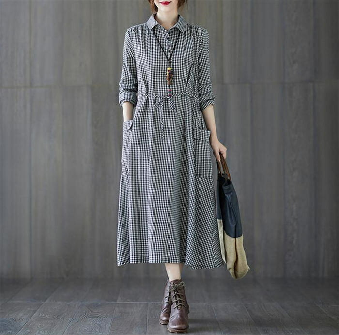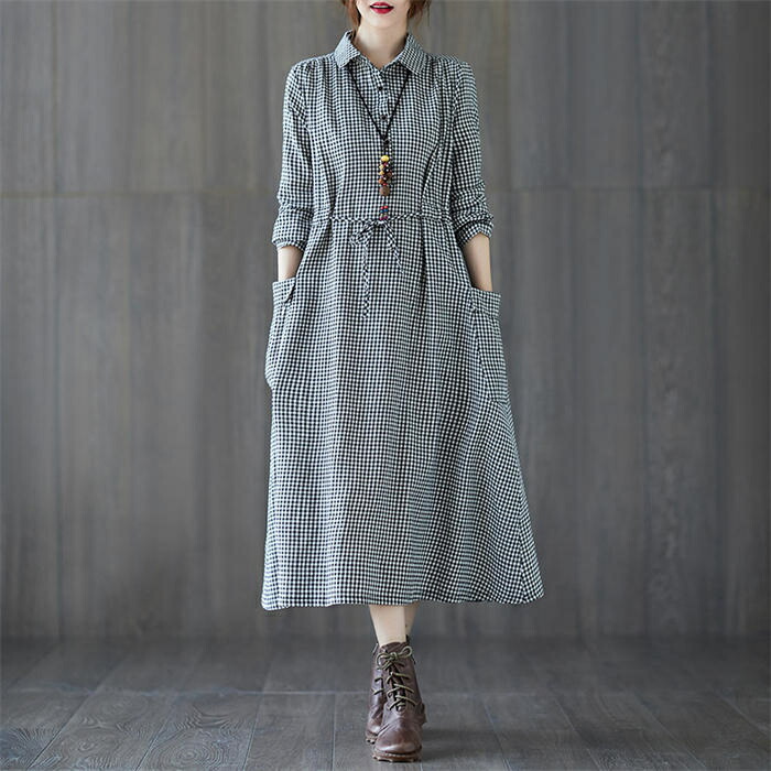 商品名 チェック シャツワンピース ワンピース レディース 秋冬 長袖 ロングワンピースワンピ ゆったり 体型カバー ワンピース ロング マキシワンピ 大人 長袖ワンピ ギャザー ウエストリボン 綿麻混 大きいサイズ フレアワンピース 30代40代50代 通勤 OL 送料無料
