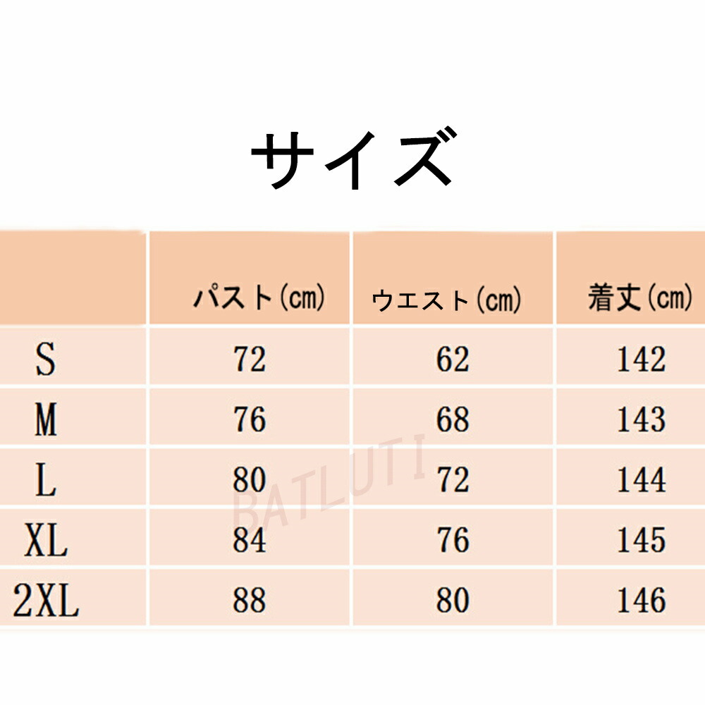 サイズ(cm):S、M、L、XL、XXL S:パスト:72cmウエスト:62cm着丈:142cm