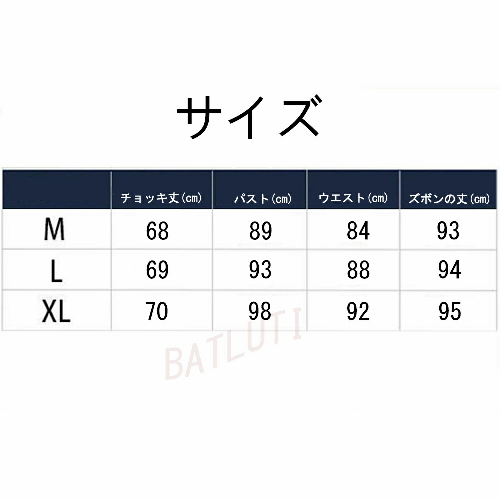 サイズ(cm):M、L、XL M:チョッキ丈:68cmパスト:89cmウエスト:84cmズボンの丈:93cm