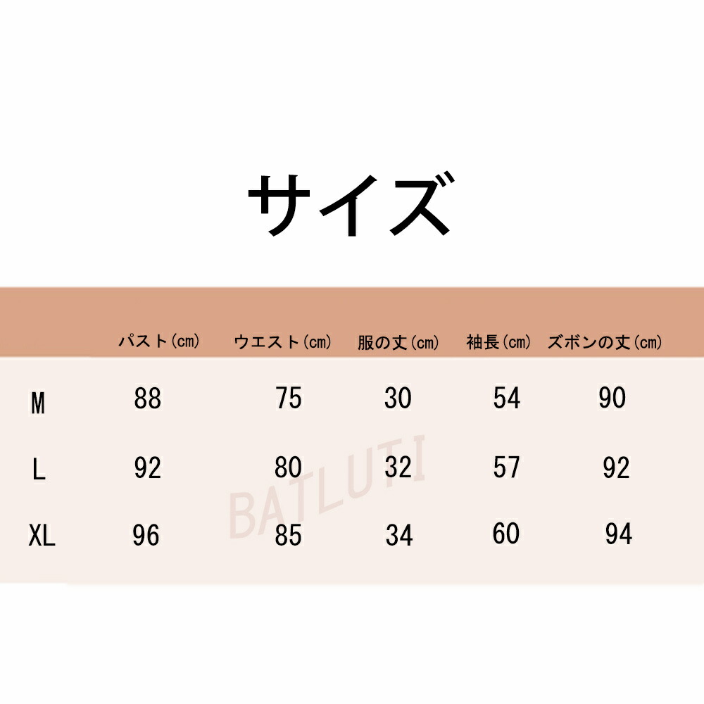 サイズ(cm):M、L、XL M:パスト:88CM 服の丈:30CM 袖長:54CM ウエスト:75CMズボンの丈:90CM