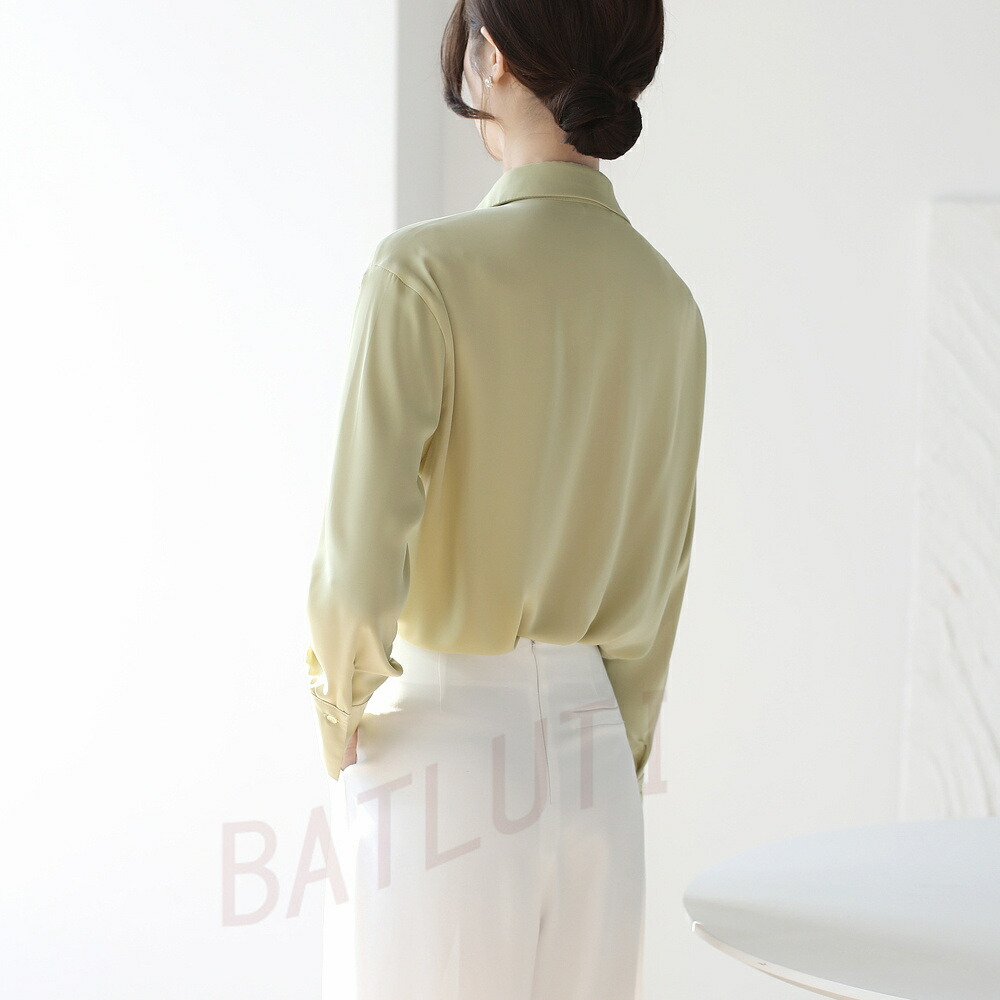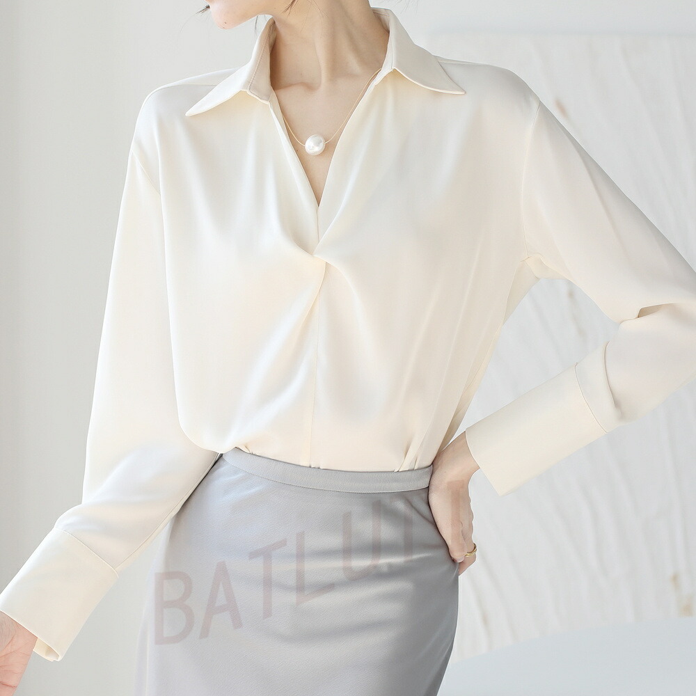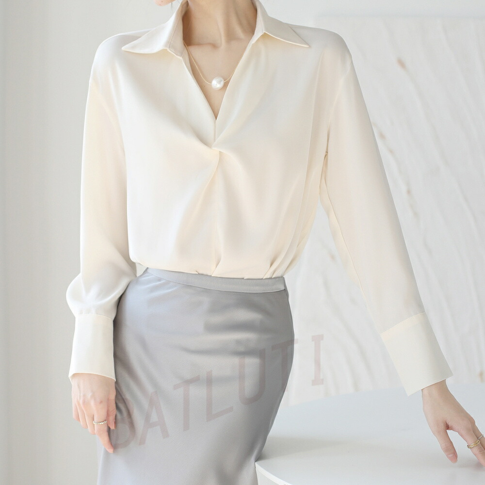 落ち着き感のあるシンプルなデザインが魅力のブラウス。透け防止素材を使用しているため、人目を気にせずジャケットを脱ぐことができます。