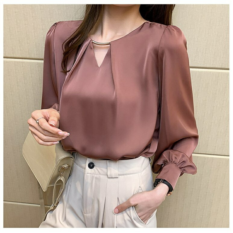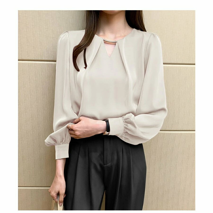 落ち着き感のあるシンプルなデザインが魅力のブラウス。透け防止素材を使用しているため、人目を気にせずジャケットを脱ぐことができます。