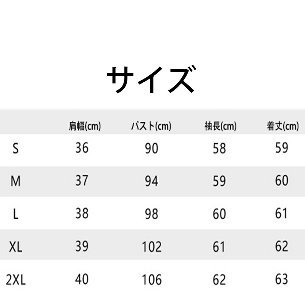 サイズ(cm):S、M、L、XL、XXL S:パスト:90CM 着丈:59CM 袖長:58CM 肩幅:36CM