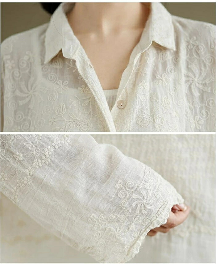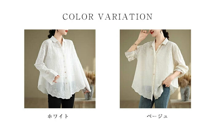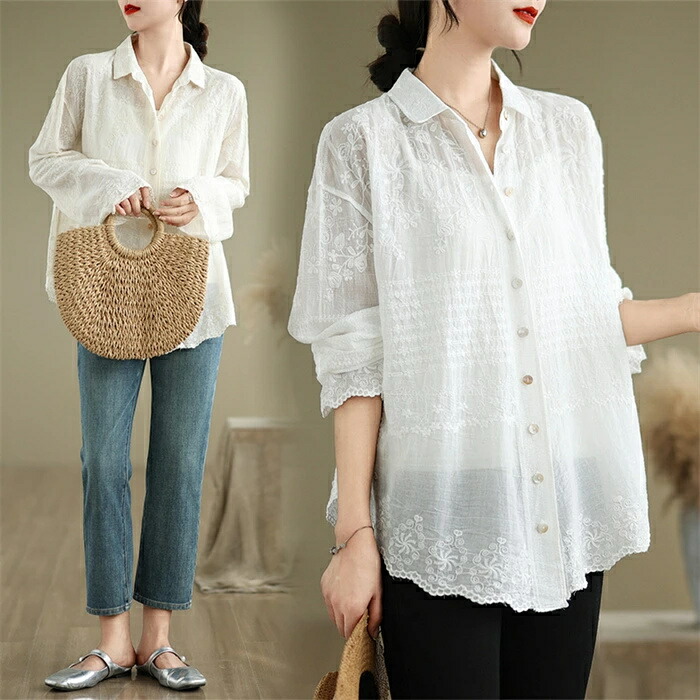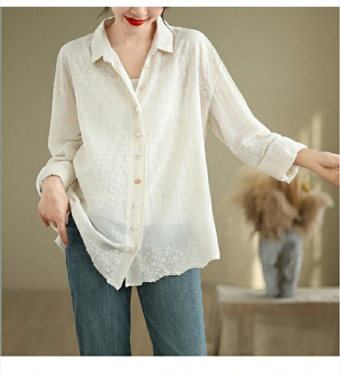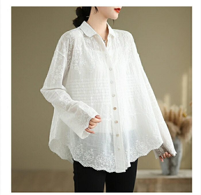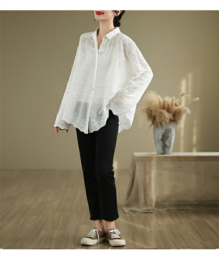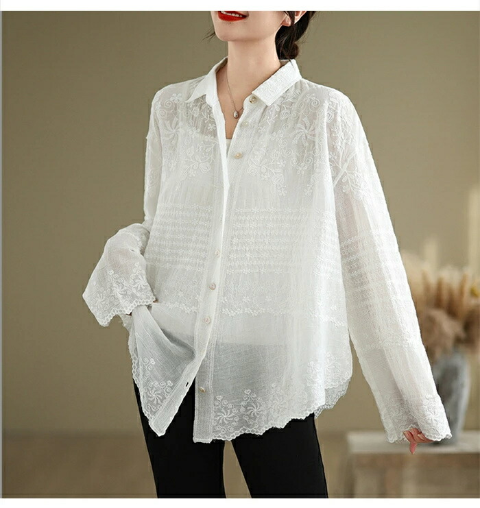 商品名 レース シャツ 長袖シャツ レディース トップス 花柄刺繍 前開き カーディガン 透け感 キレイめ 春 夏 秋 大人可愛い 通勤 オフィス フェミニン 森ガール ゆったり 大きいサイズ 体型カバー 送料無料