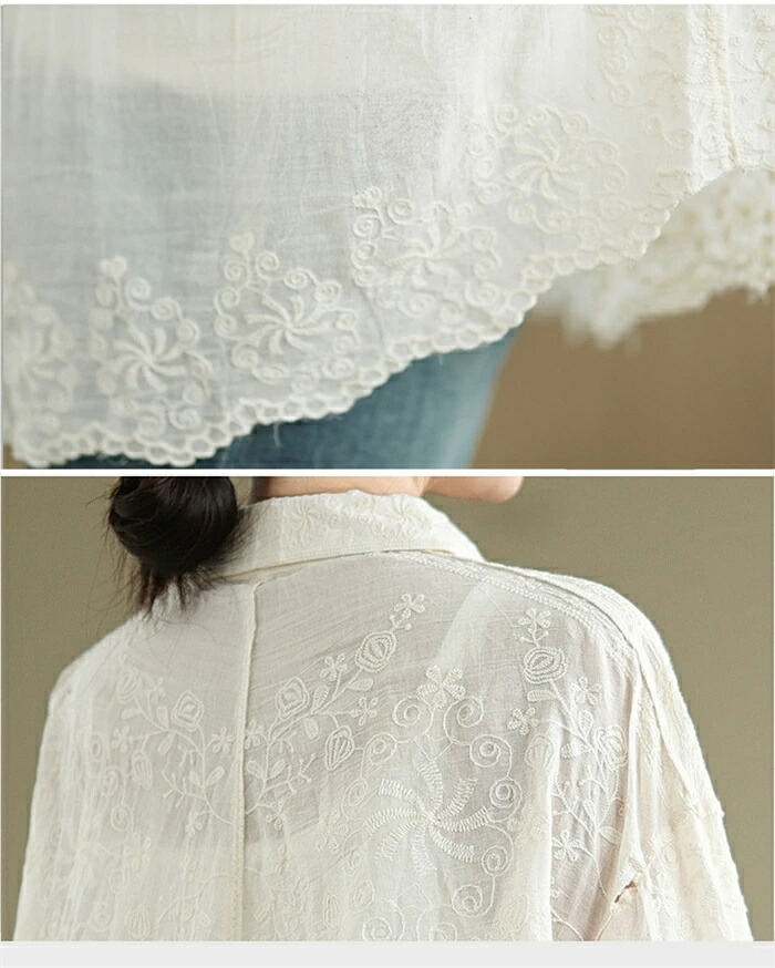 花柄刺繍 レース シャツ ブラウス チュニック 長袖 前開き カーデ 春秋 フェミニン 紫外線対策 冷房対策 日焼け止め
