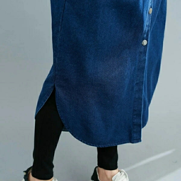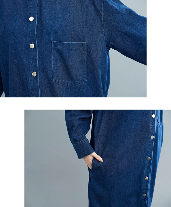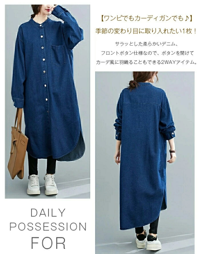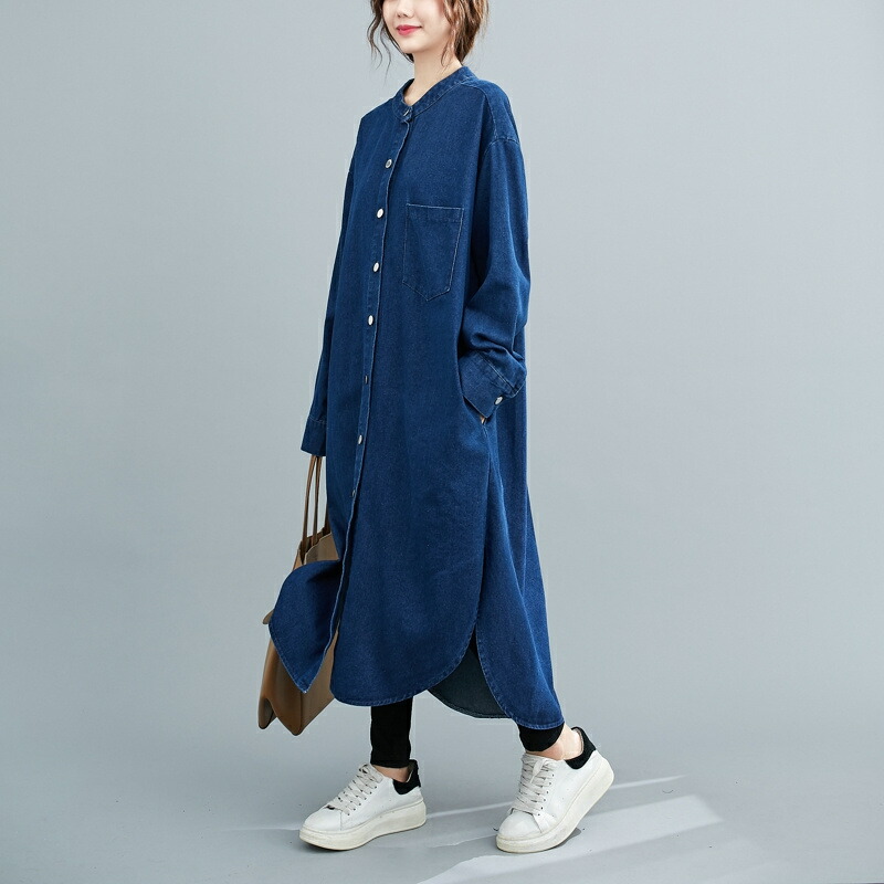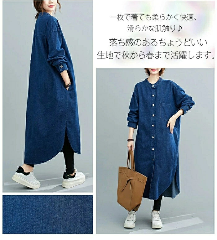 商品名 ノーカラー デニムシャツワンピース レディース デニム シャツワンピース ワンピース ロングシャツ シャツワンピ シャツ ロング丈 チュニック 大人 羽織 ライトアウター 秋ワンピ 体型カバー 通学 通勤 着痩せ春 秋 冬 送料無料