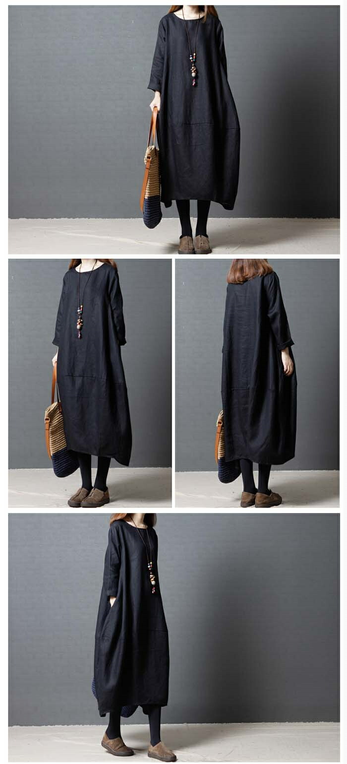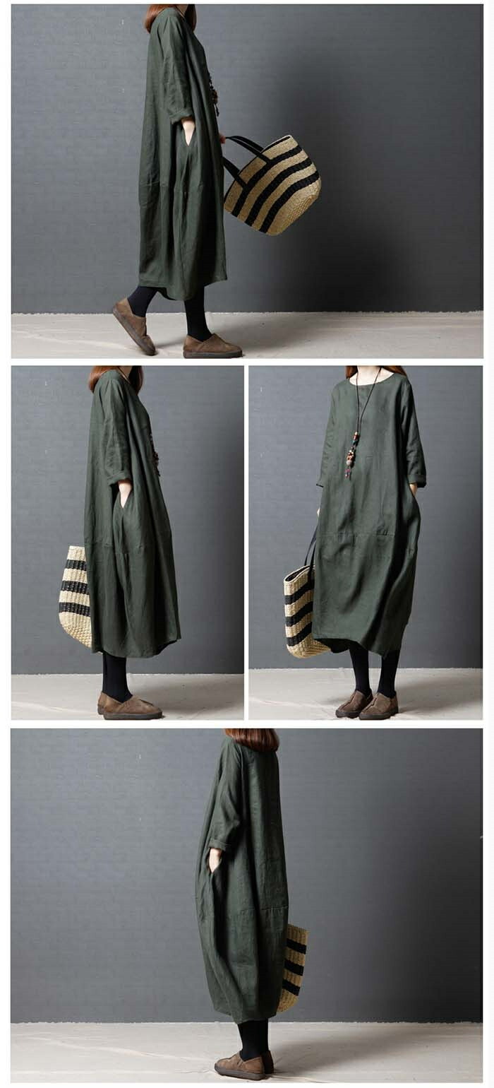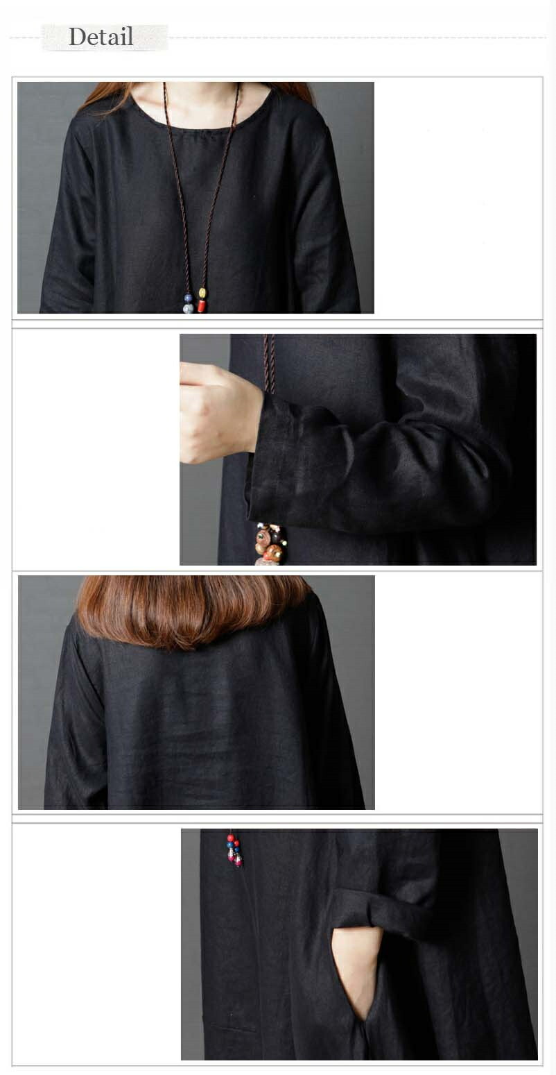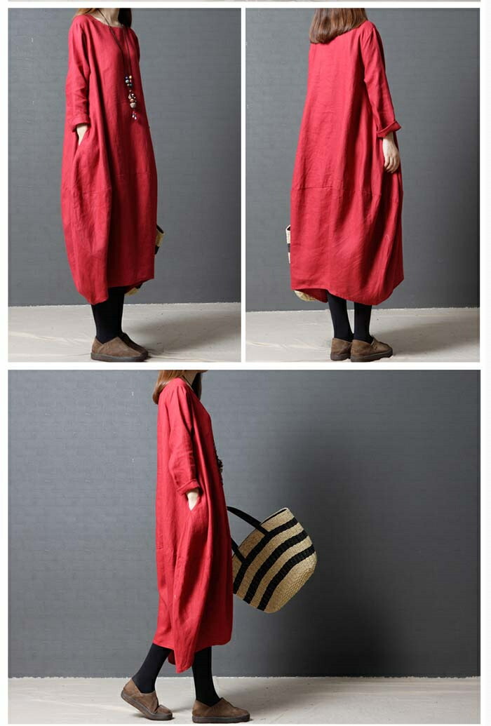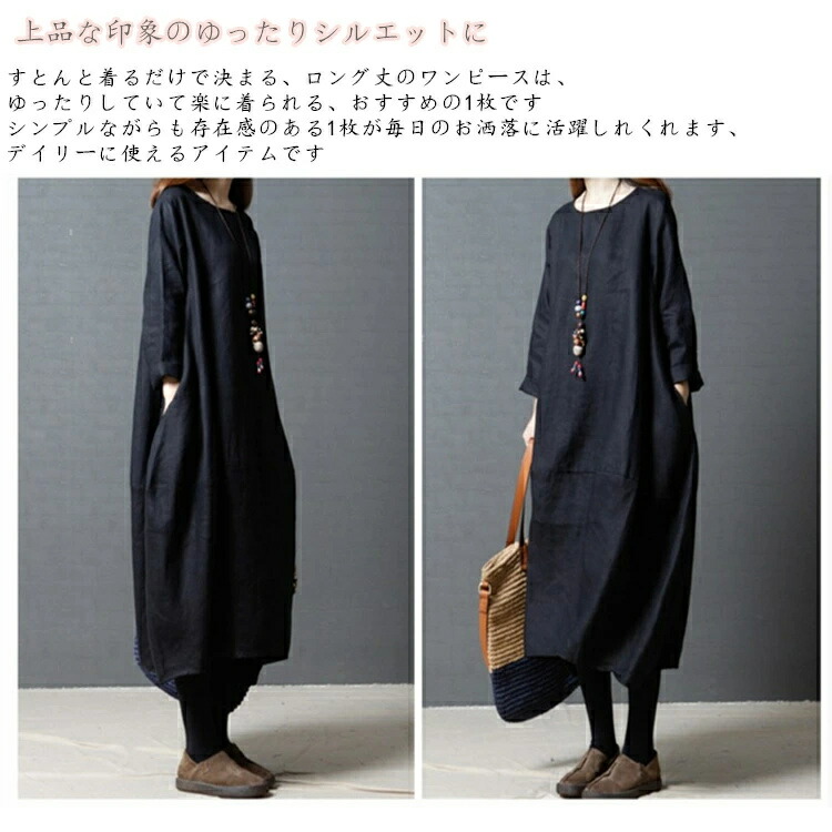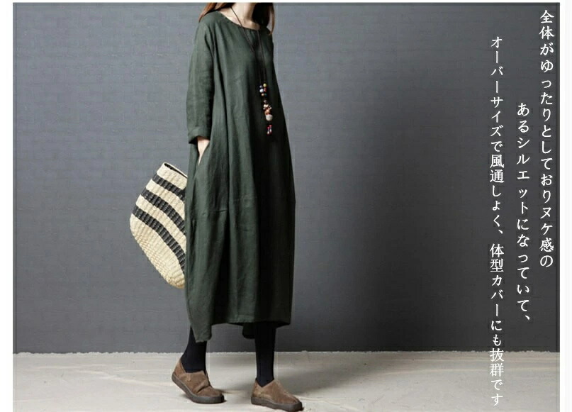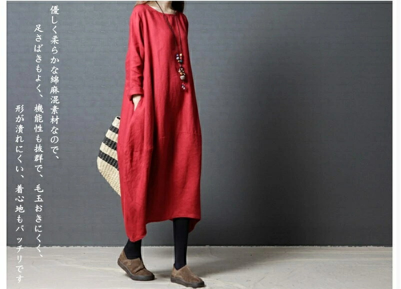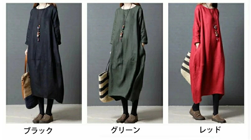 商品名 ワンピース 春 長袖 レディース ロングワンピース ロング リネン風 カジュアル 膝下 リネンタッチ 大きいサイズ 秋ワンピ シンプル 体型カバー 着痩せ ゆったり コクーン 赤 黒 緑 20代 30代 40代 50代 送料無料