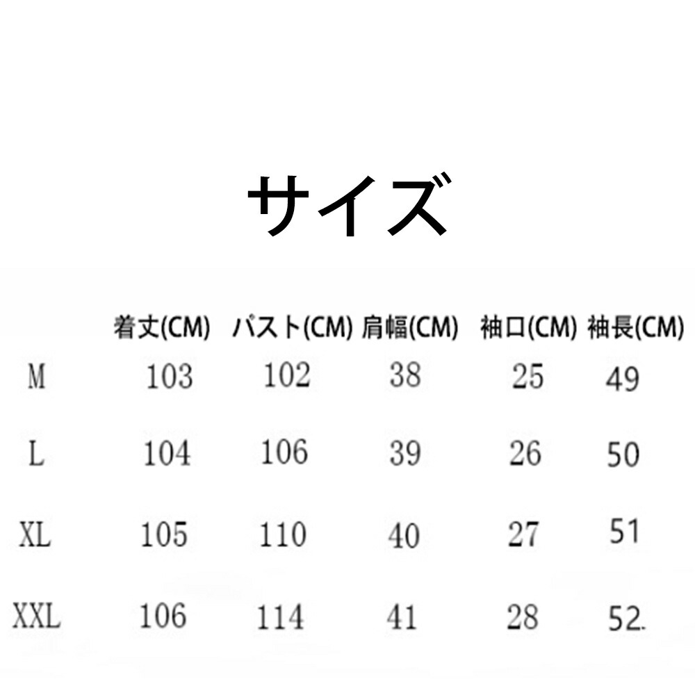サイズ(cm):M、L、XL、XXL M:パスト:102CM 着丈:103CM 肩幅:38CM 袖長:49CM 袖口:25CM