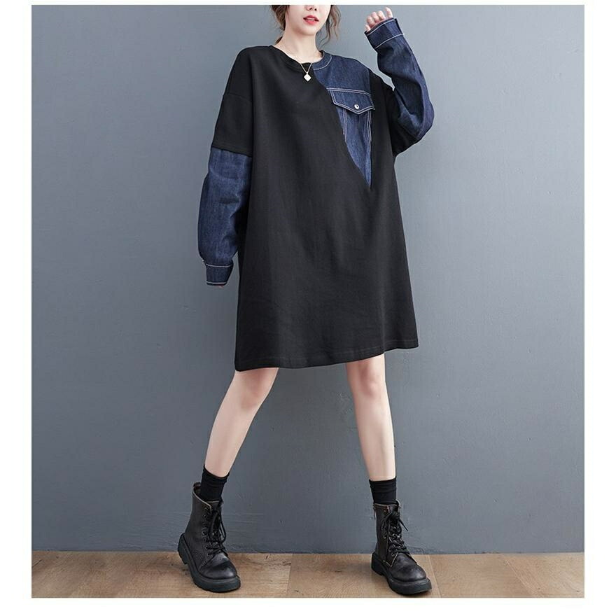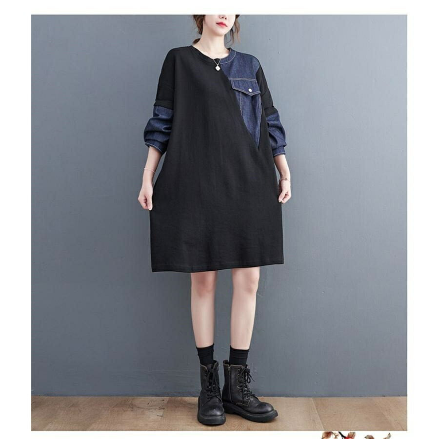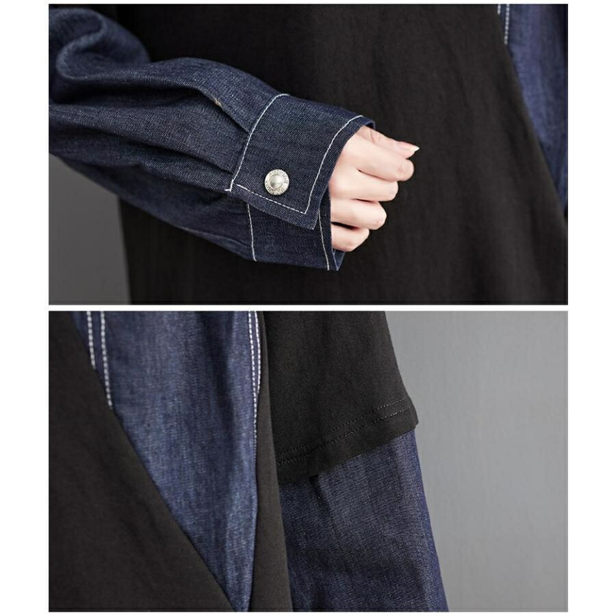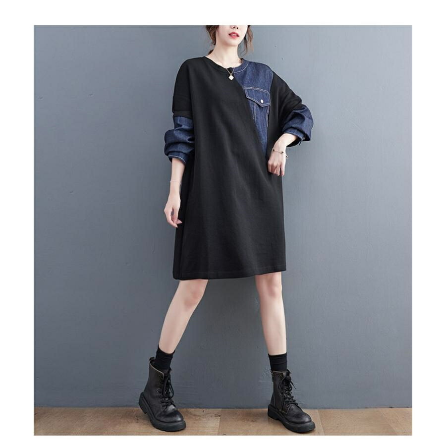 [BATLUTI]秋ワンピース レディース デニム 切り替え 膝丈ワンピ 個性的 長袖 Uネック さりげなく体型カバー お洒落 オーバーサイズ ゆったりシルエット
