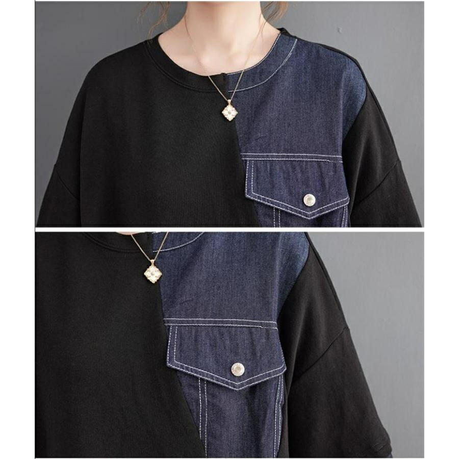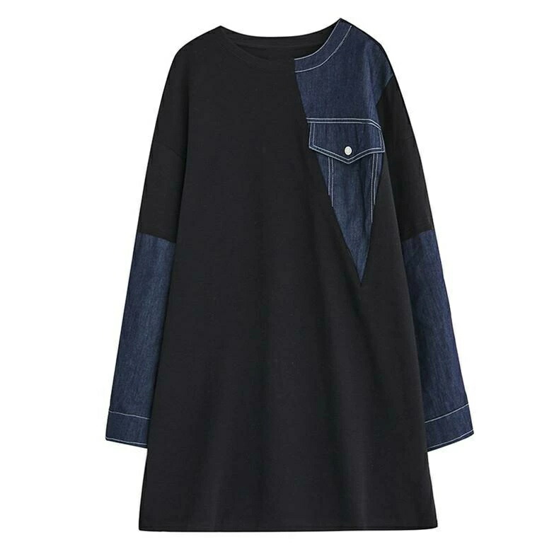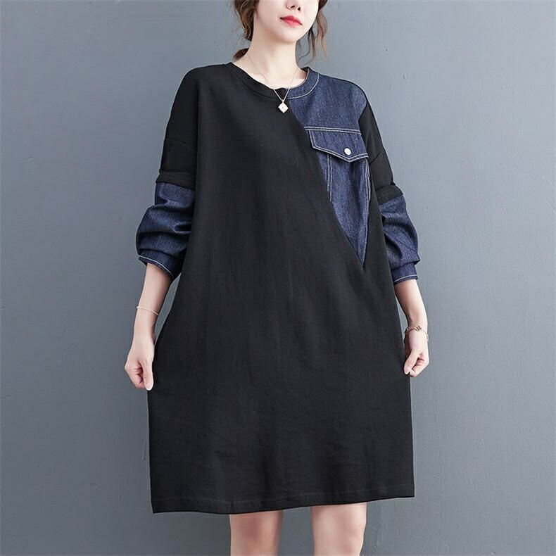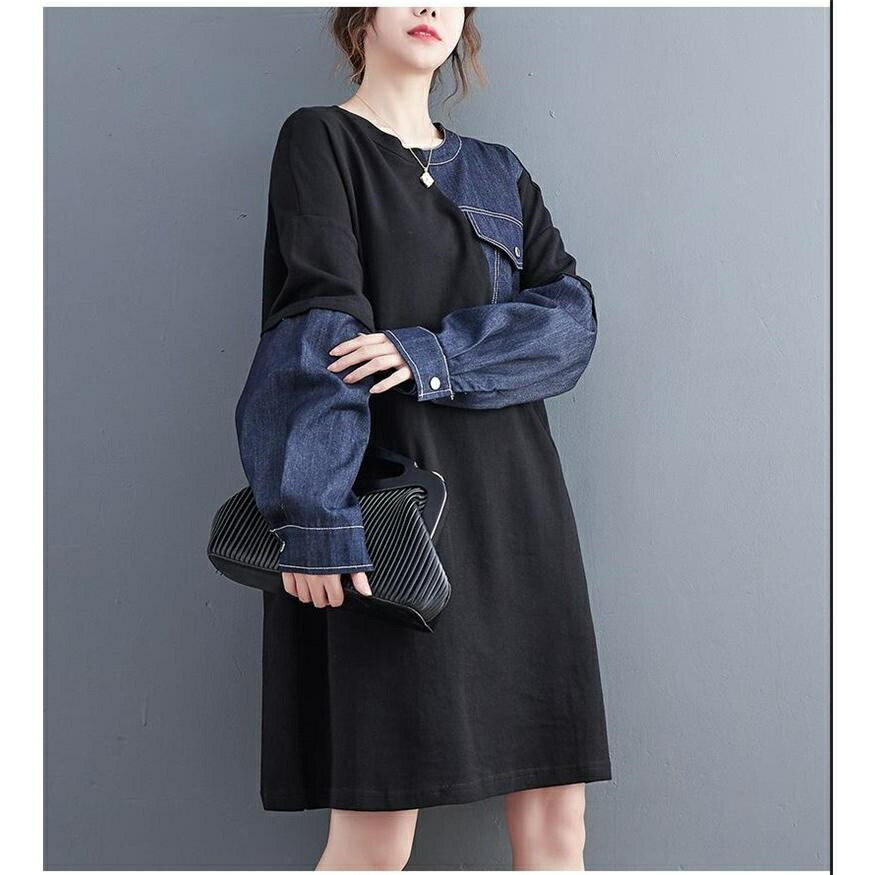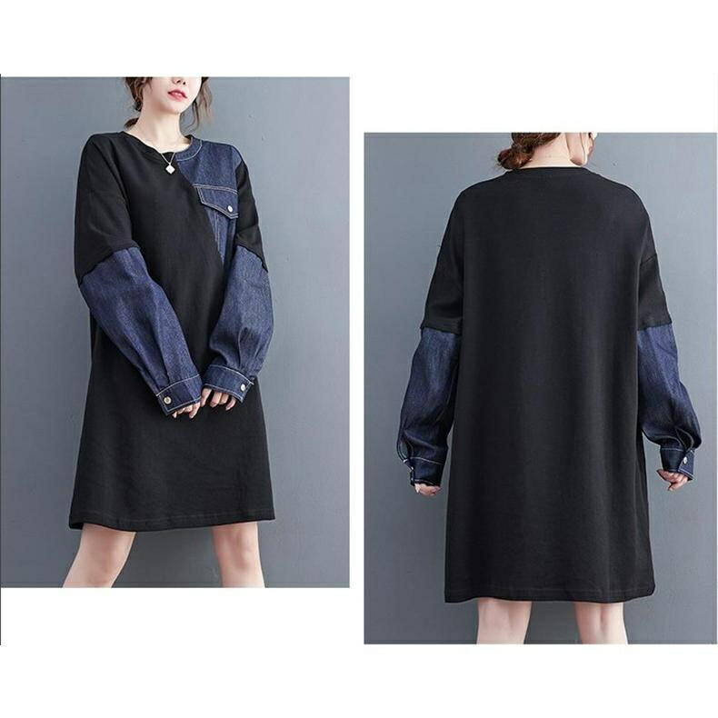 [BATLUTI]秋ワンピース レディース デニム 切り替え 膝丈ワンピ 個性的 長袖 Uネック さりげなく体型カバー お洒落 オーバーサイズ ゆったりシルエット