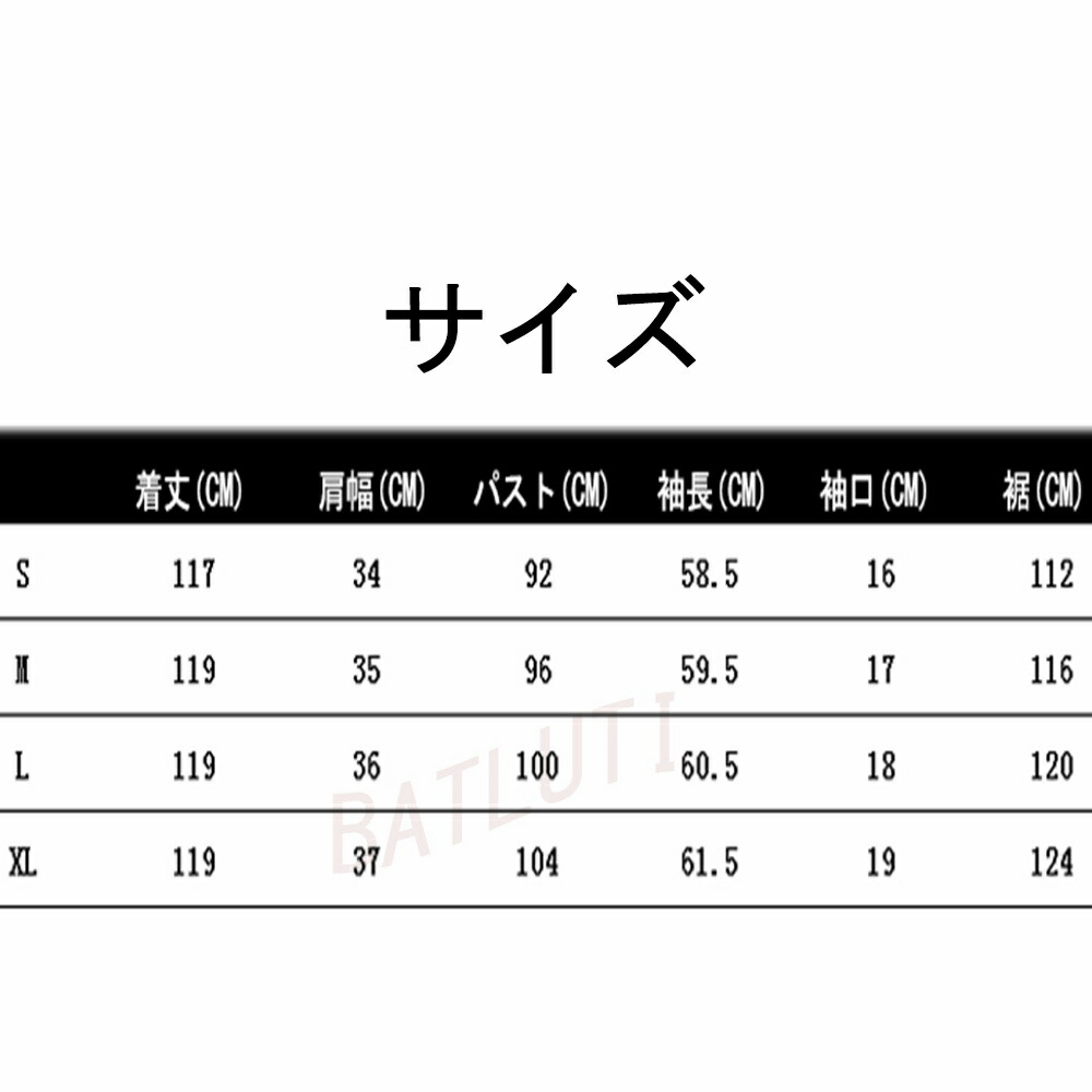 サイズ(cm):S、M、L、XL S:肩幅:34CM バスト:92CM 着丈:117CM 袖長:58.5CM 袖口:16CM 裾:112CM