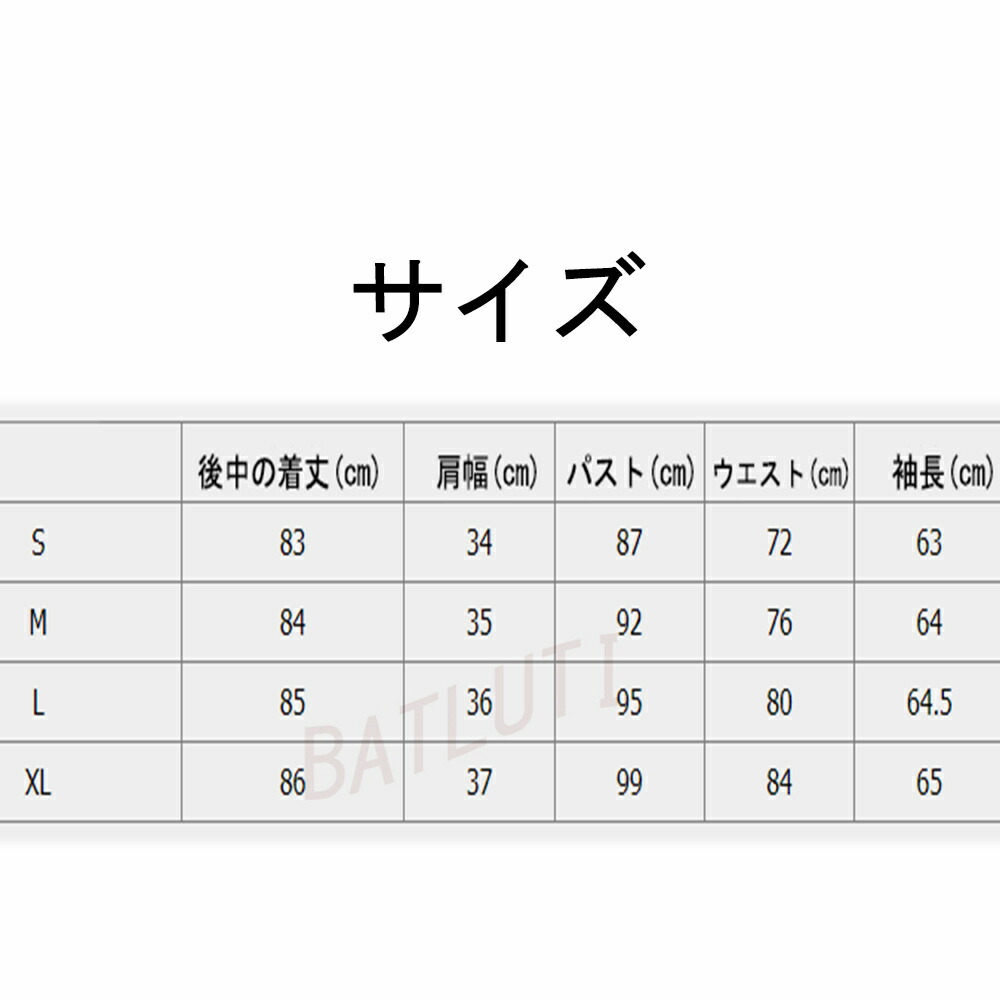 サイズ(cm):S、M、L、XL S:肩幅:34CM バスト:87CM 後の中着丈:83CM 袖長:63CM ウエスト:72CM
