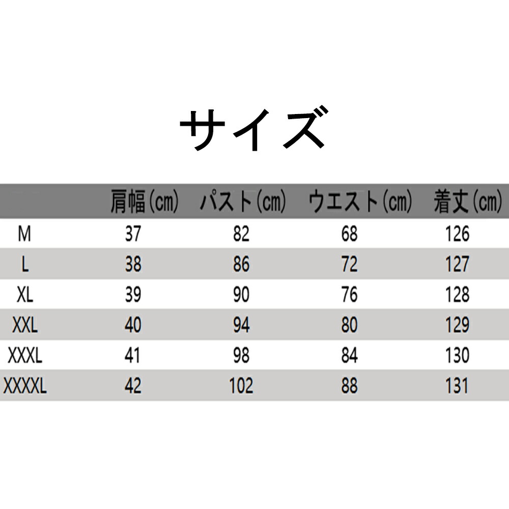 サイズ(cm):M、L、XL、XXL、XXXL、XXXXL M:肩幅:37CM バスト:82CM 着丈:125CM ウエスト:70CM