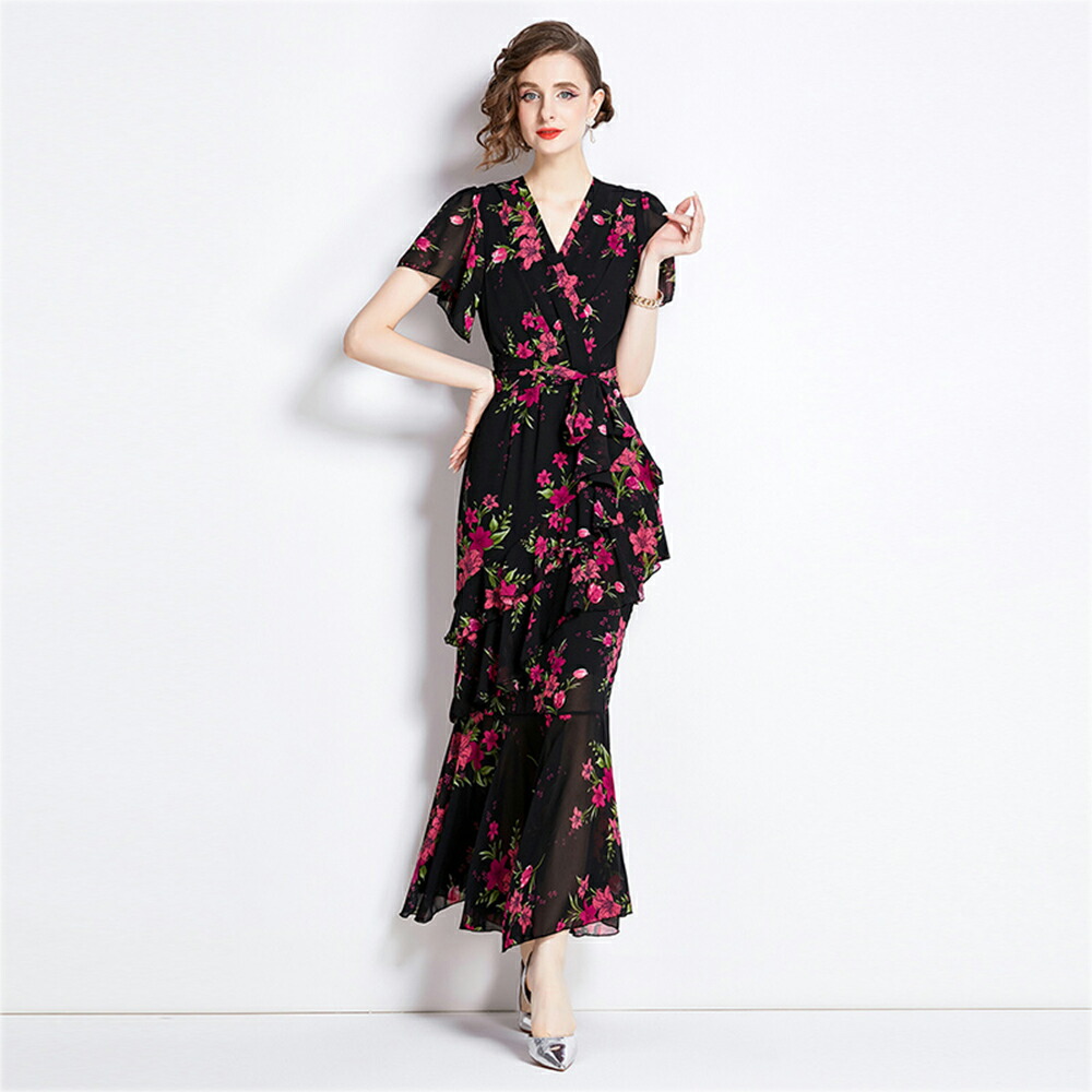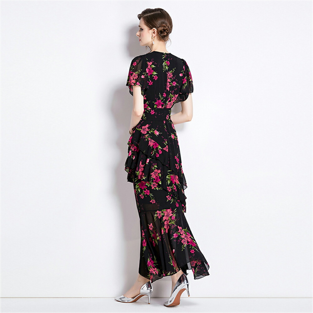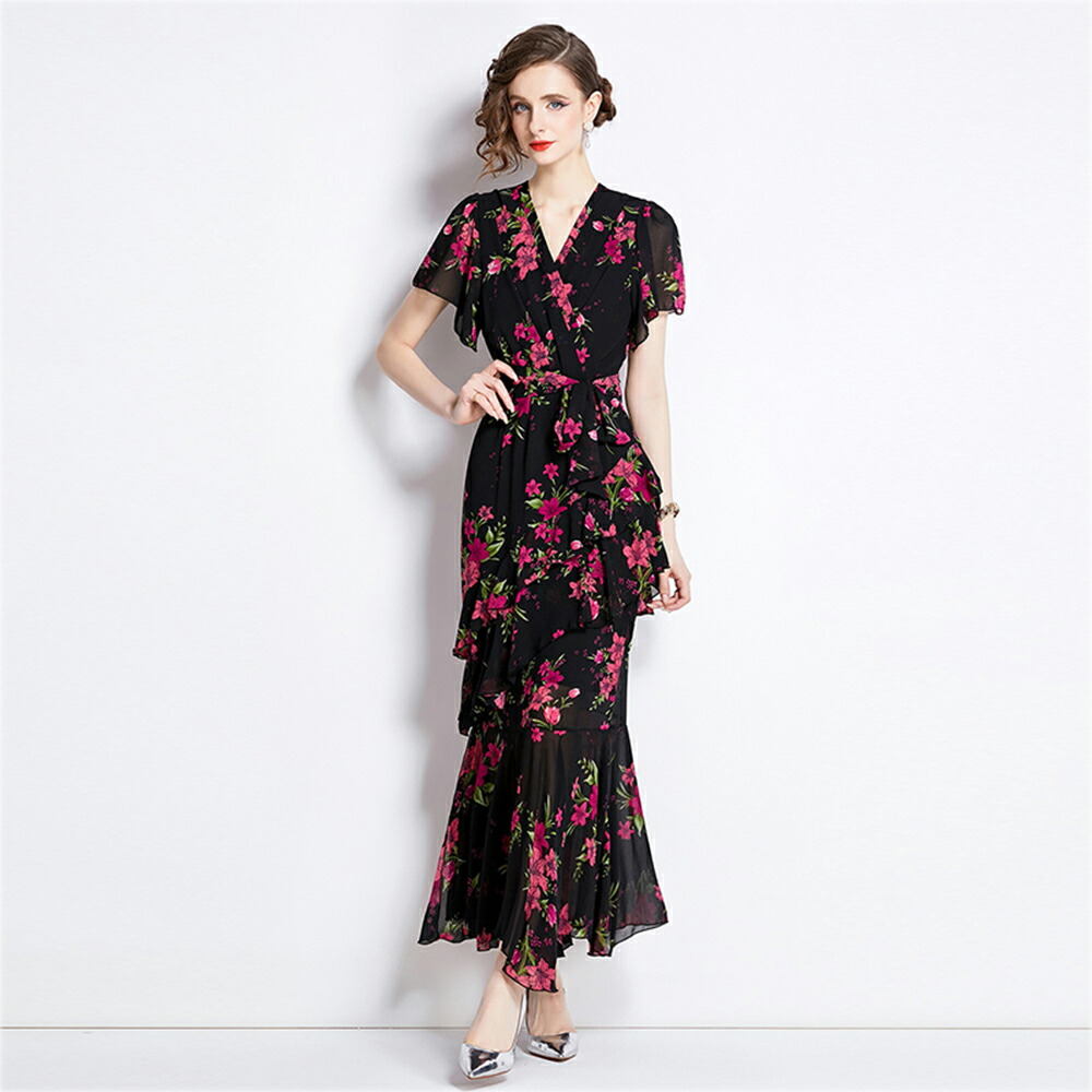 ワンピース パーティードレス 不規則ワンピース Vネック 半袖 マキシ丈ワンピース 結婚式 二次会 カジュアル 二次会 リゾート ロング丈 着痩せ
